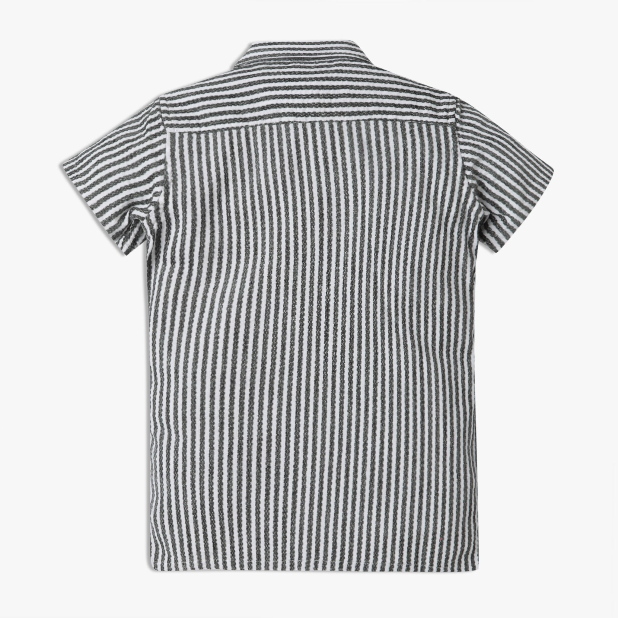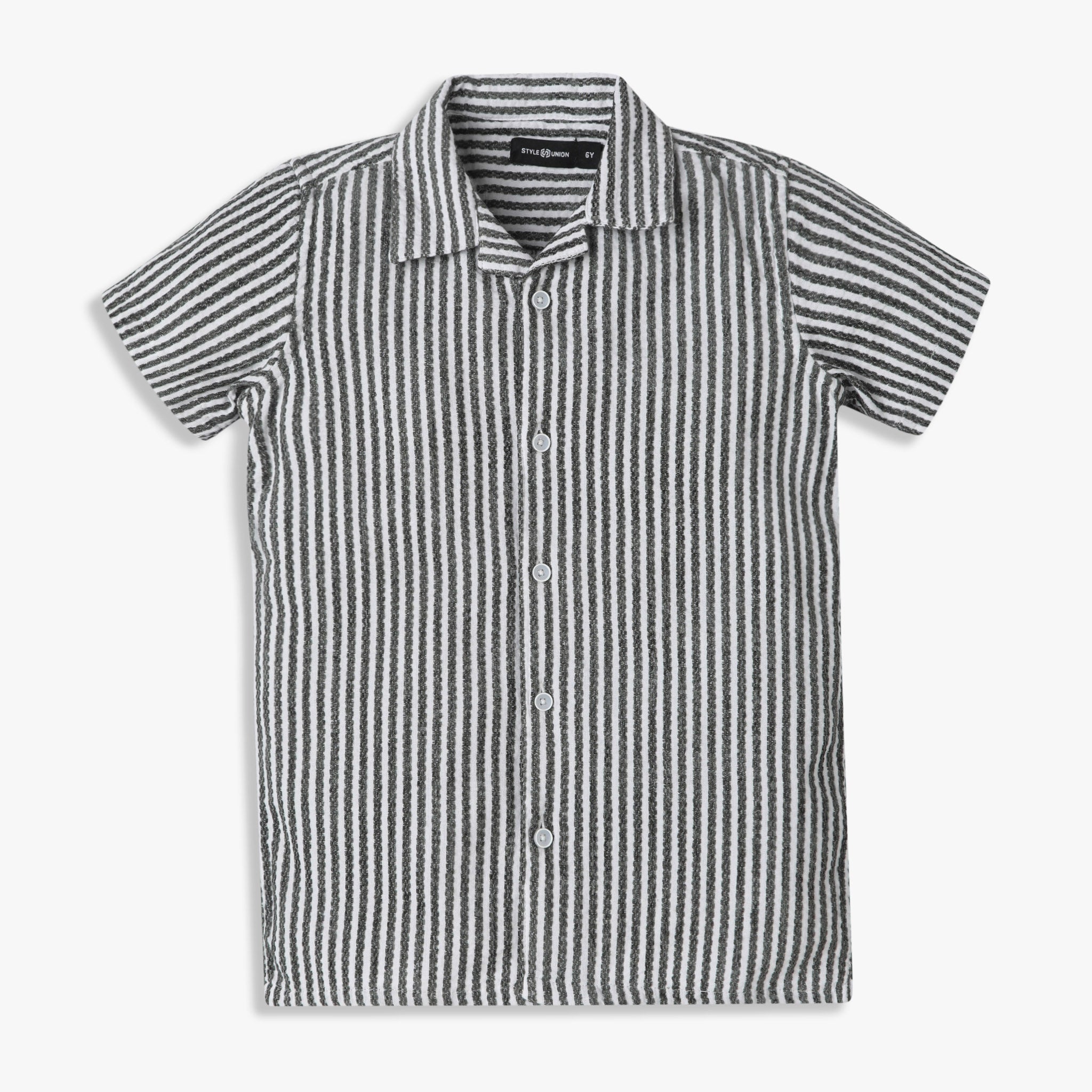 Experience the perfect blend of comfort and style with our Boys Striped Camp Collar Retreat Half Sleeve Shirt. Crafted from 100% cotton, this shirt ensures breathability and softness, making it ideal for all-day wear. The classic striped pattern and camp collar add a touch of sophistication, perfect for both casual outings and special occasions.