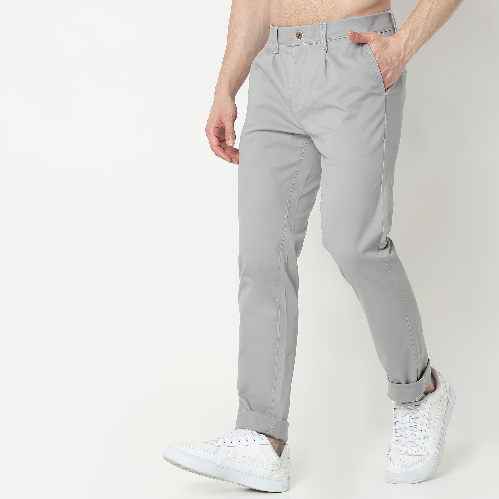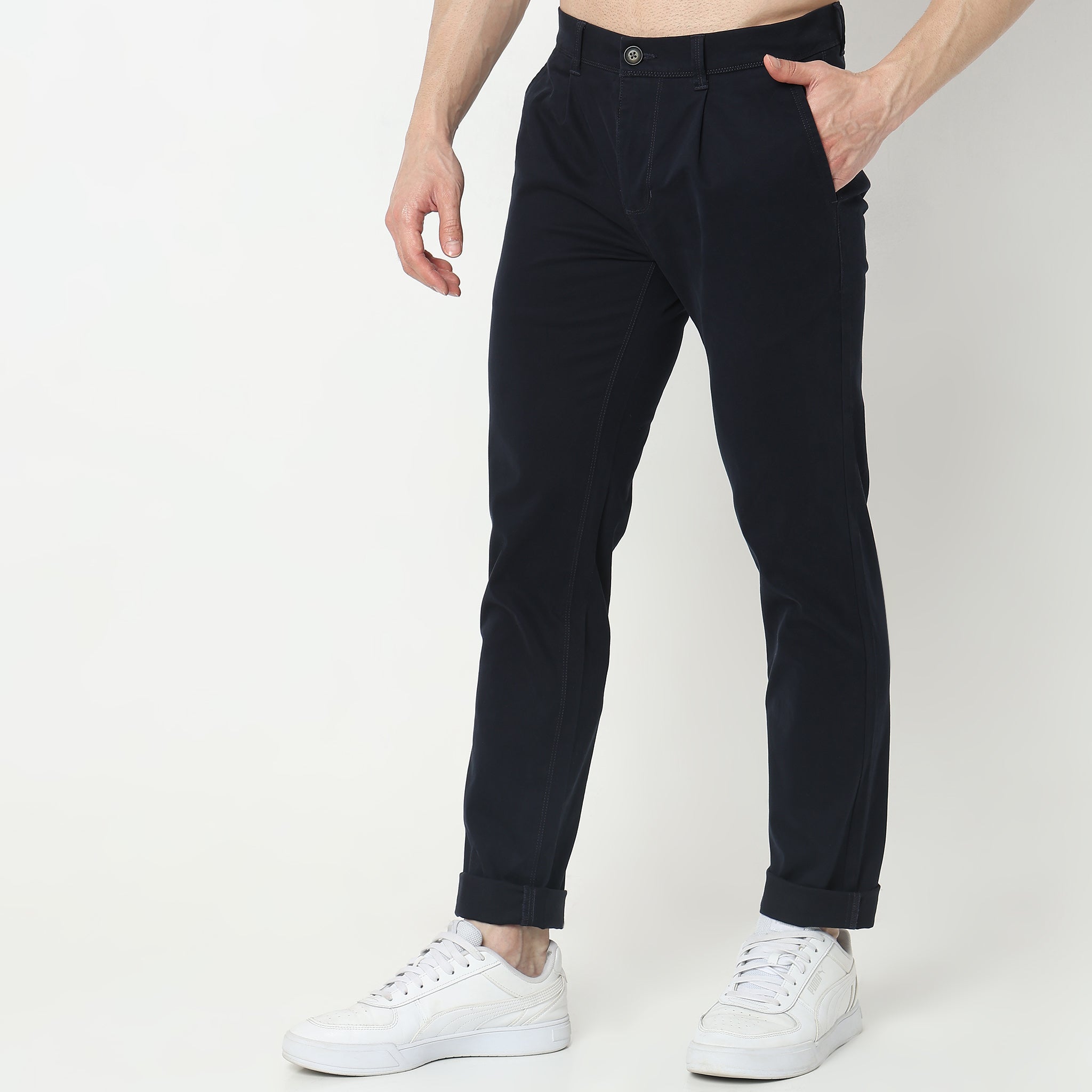 These modern nerd theme, solid pattern regular fit chinos has ankle length, mid rise waist. Made from cotton, it is soft and comfortable to wear.