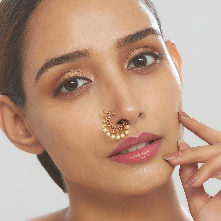 Antique Clip On NathSteal the spotlight with Kushal's antique nath. Featuring vibrant ruby or classic white stones and a chic gold polish, it’s designed to impress. Crafted from durable copper alloy with a secure pressing mechanism, this nath is both stylish and reliable. Perfect for adding a subtle yet sophisticated flair to any outfit.