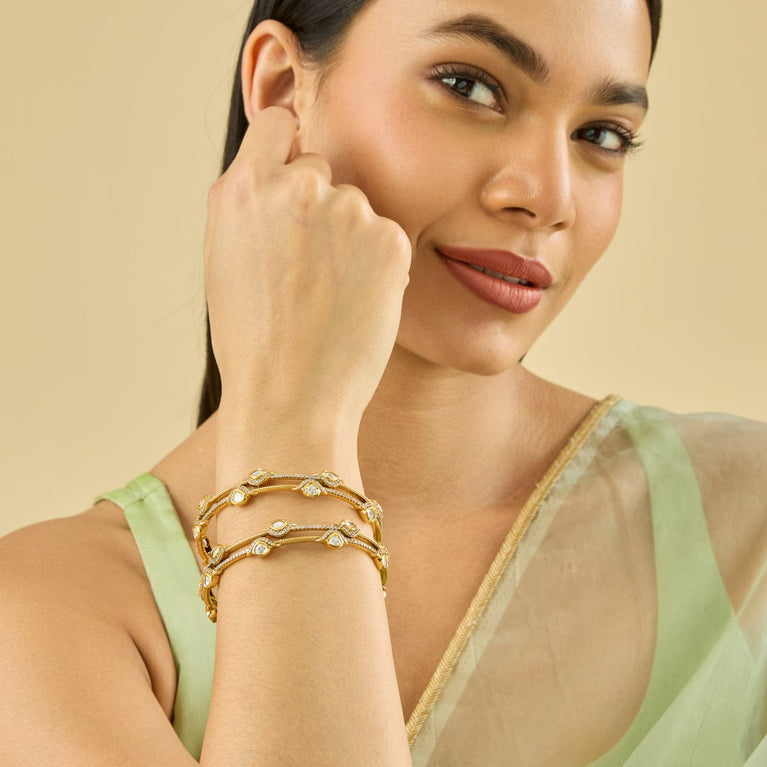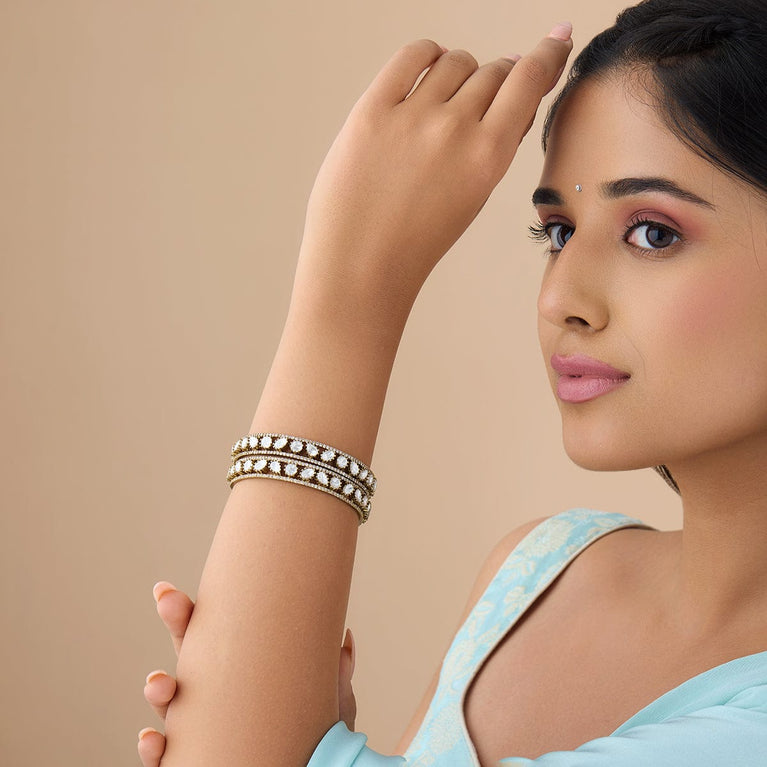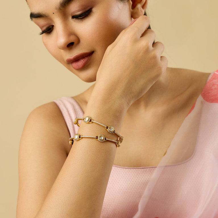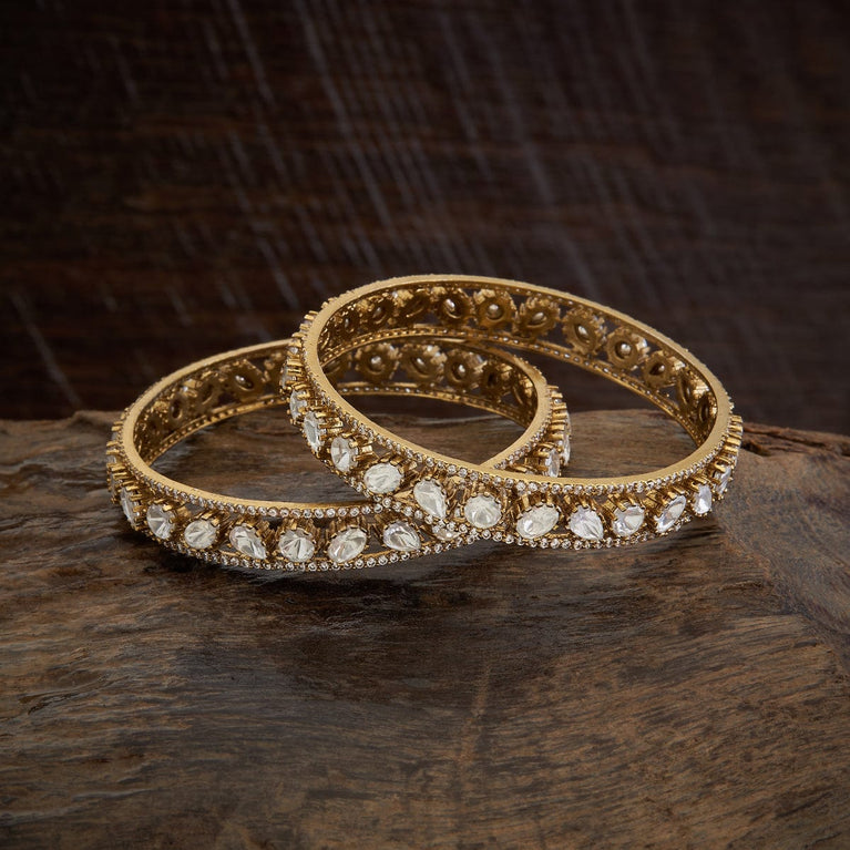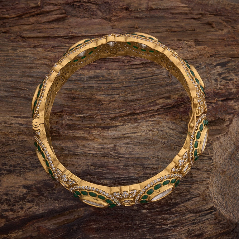 Kushal's Fashion Jewellery Kundan BangleKundan stones are splendid on their own, but when paired with other stones, you get an accessory that blinds everyone with its shine, like our latest Kundan bangle with green stones. The locking system of this bangle will keep you comfortable at all times for the best wearing experience with your favorite outfit.