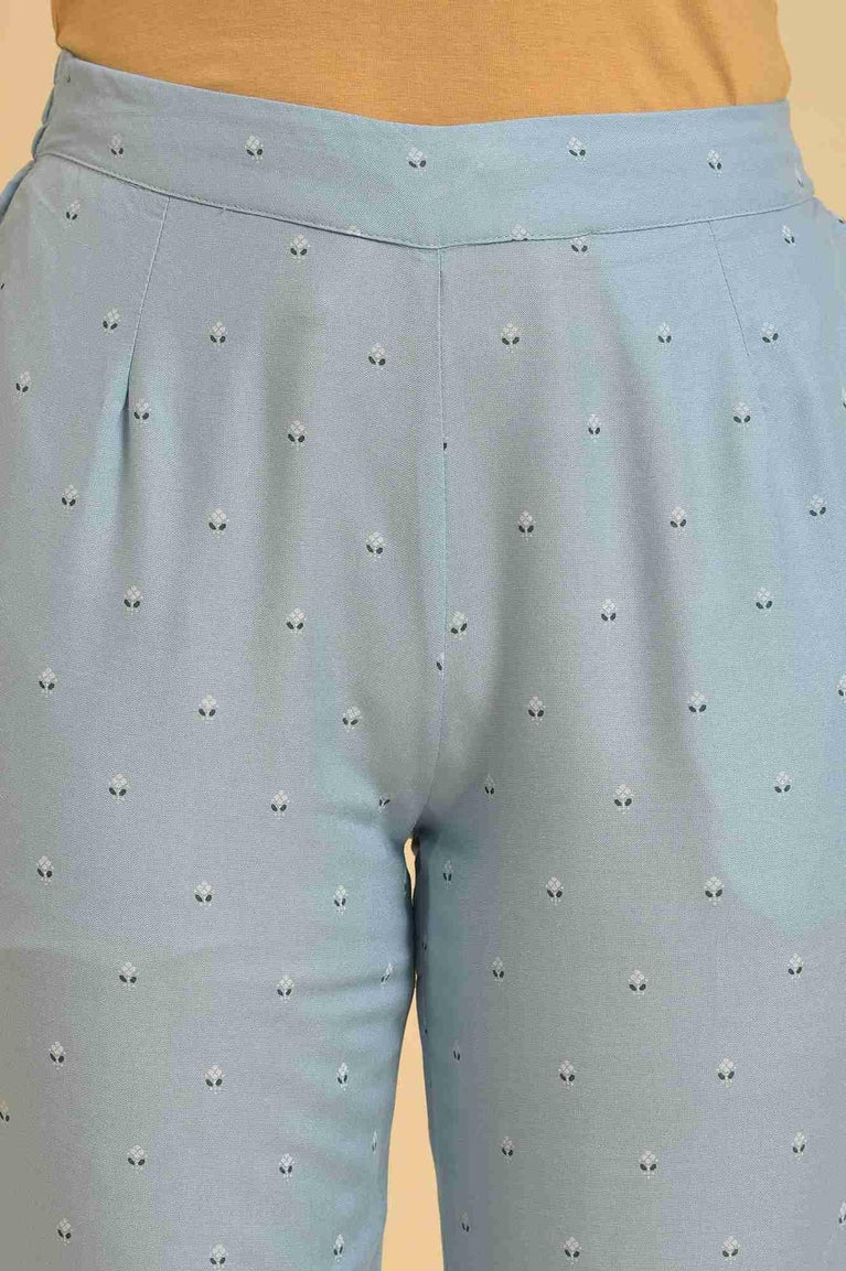 Sky Blue Printed Coord Set In Rayon Flax. It Includes An A-Line kurta With A Keyhole Neckline, Which Is Embellished With Print All Over And Comes With Matching Parallel Pants.