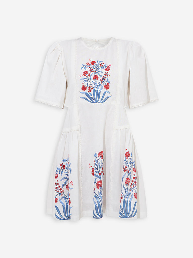 Bombay Paisley White Floral Detailed Cotton Straight Dress