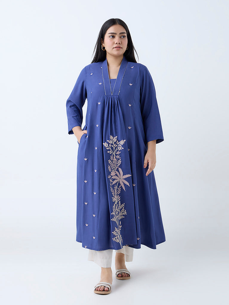 Diza Dark Blue Floral Embroidered A-Line Kurta