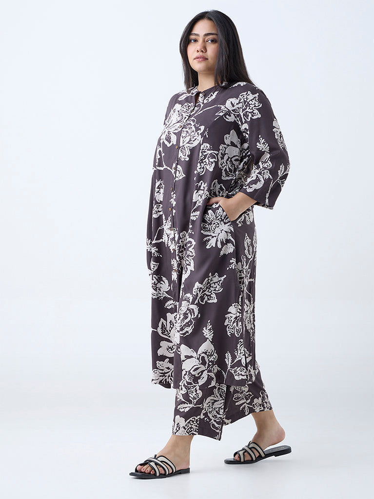Diza Dark Brown Floral Pattern A-Line Kurta