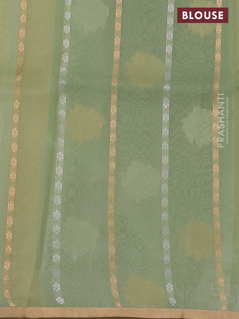 Banarasi organza silk saree pastel green with silver & gold zari weaves and zari woven piping border