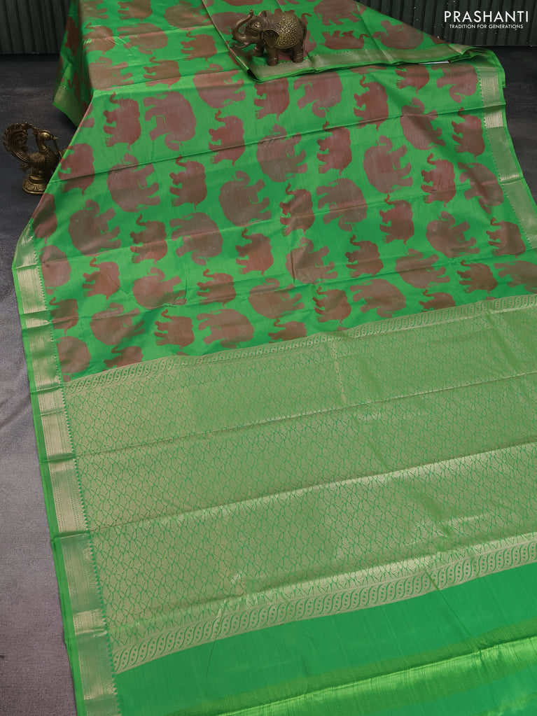 Bangalori semi silk saree fluorescent green with allover elephant butta ikat weaves and zari woven border