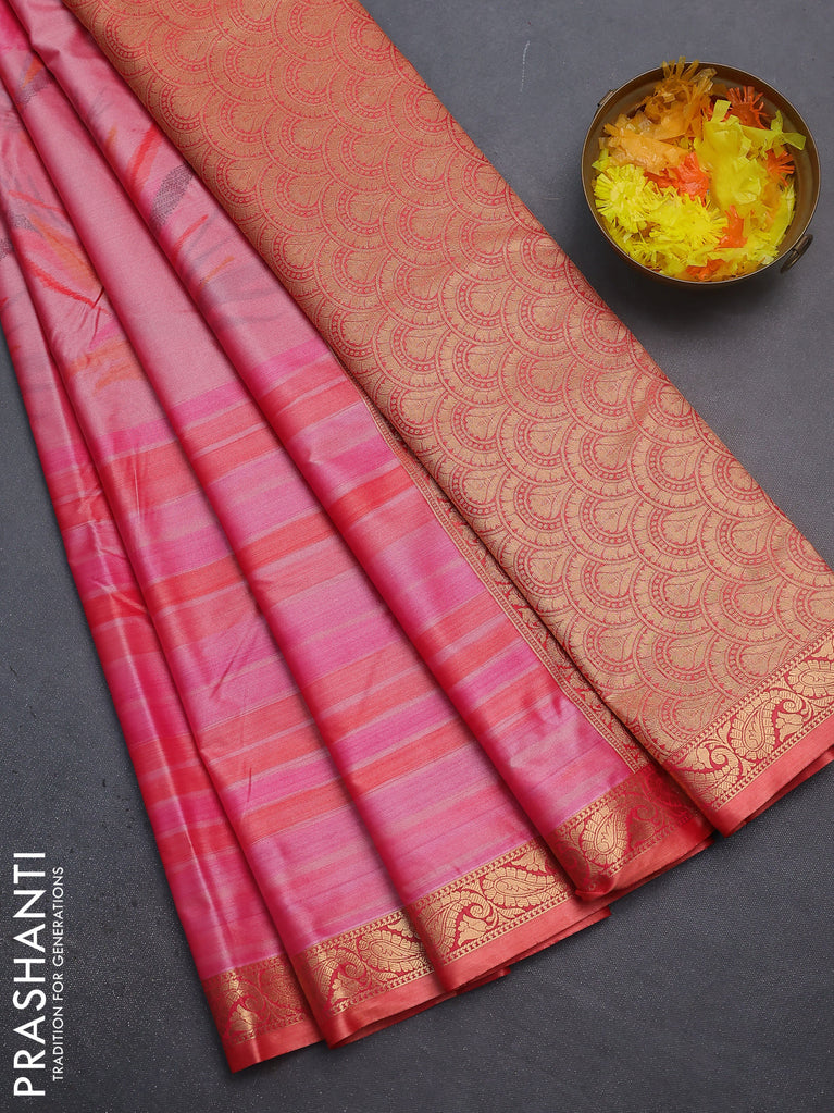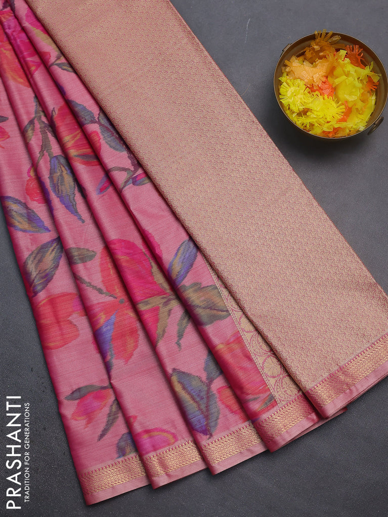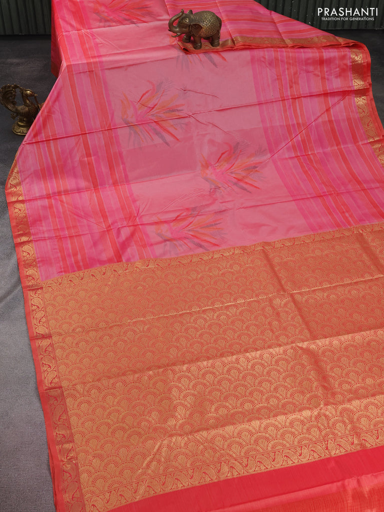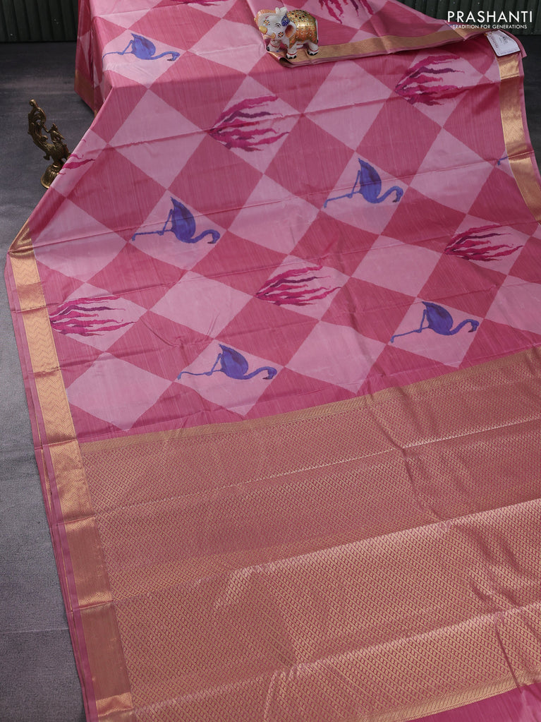 Bangalori semi silk saree peach pink and pink with floral design ikat weaves and zari woven border