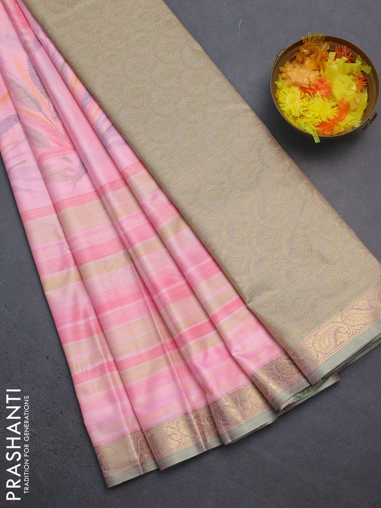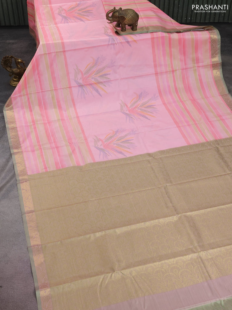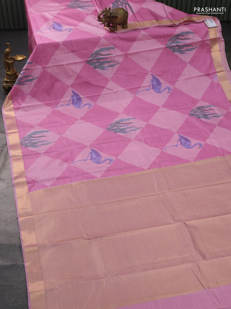 Bangalori semi silk saree pastel pink and grey with elephant butta ikat weaves and zari woven border