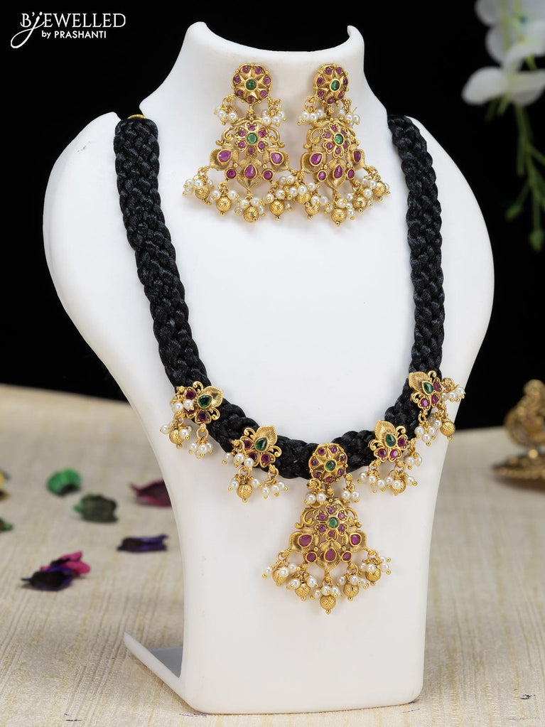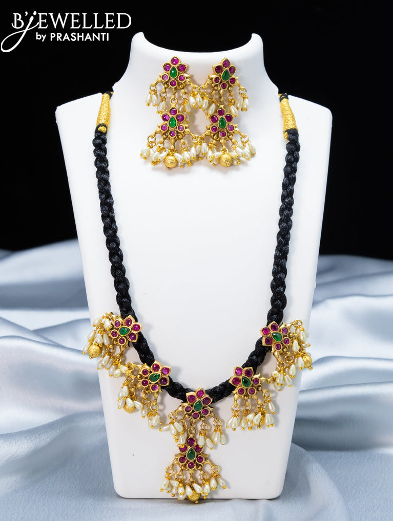 Black thread necklace manga pattern with kemp & kundan stones and pearl hangings
