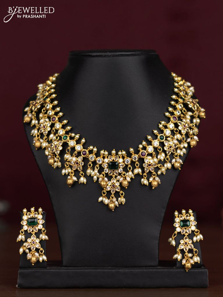 Antique guttapusalu necklace floral design with kemp & cz stones and pearl & beads hanging