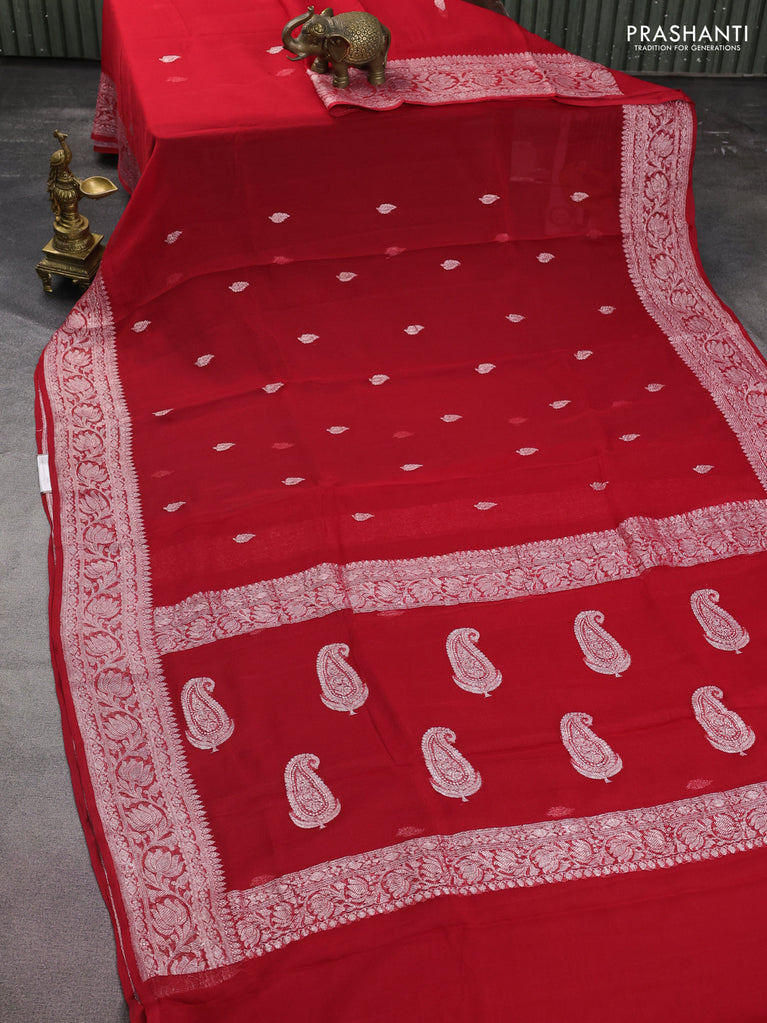 Banarasi chiffon silk saree red with silver zari woven buttas and silver zari woven border