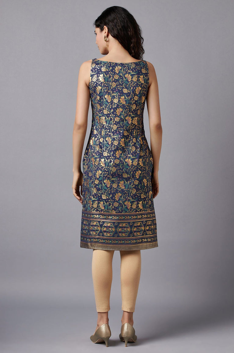 A dark blue fit-and-flare overlay designed in luxurious misdent fabric, consisting of a pleated waist with gathers and a drawstring closure with pristine white tassels. It comes with a floral printed noodle strap straight kurta.