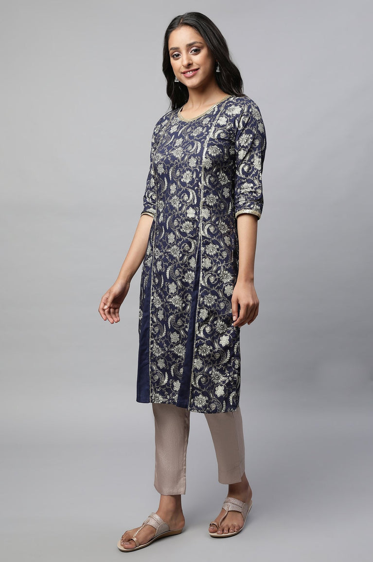 Give winter chills a warm welcome with this Ink blue winter ethnic winter kurta. This straight silhouette kurta features round neck and geometric print with border at hem.