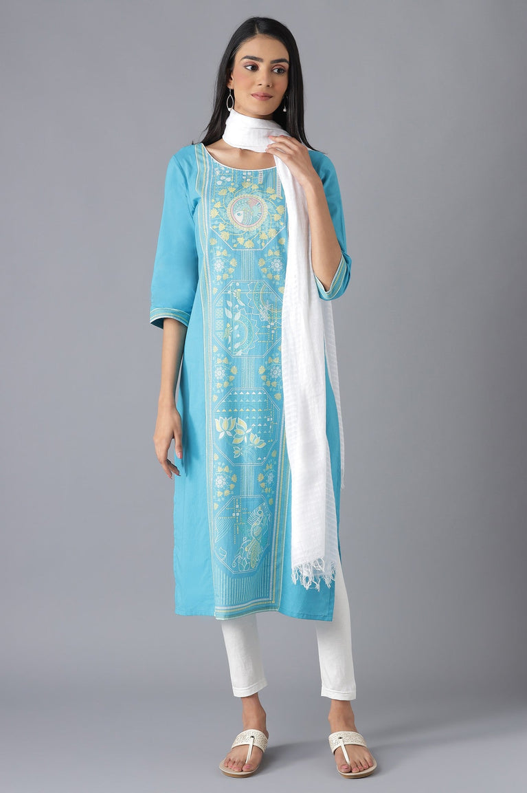 Pagoda blue printed kurta in round neck and three-quarter sleeves.
