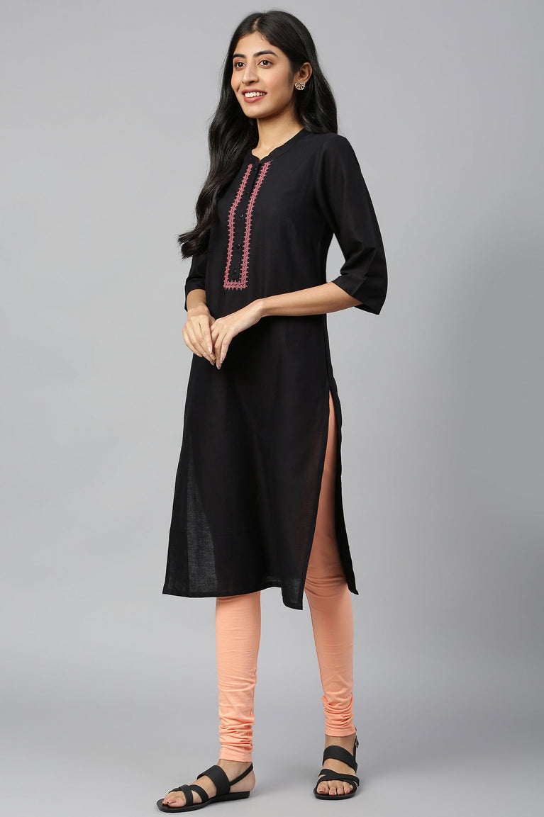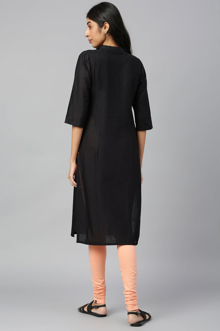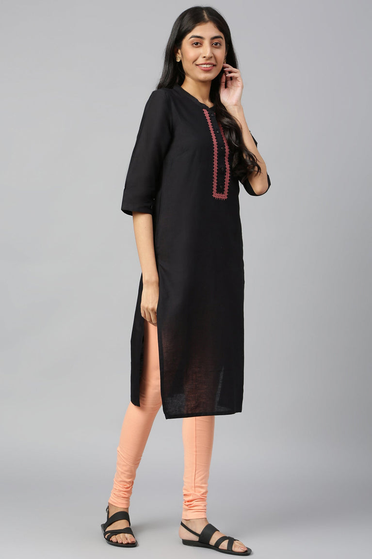 Black Coloured Cotton Flax Solid Straight kurta Having Thread Embroidery, Mandrin Collar With Buttoned Placket And Three-Quarter Sleeves.
