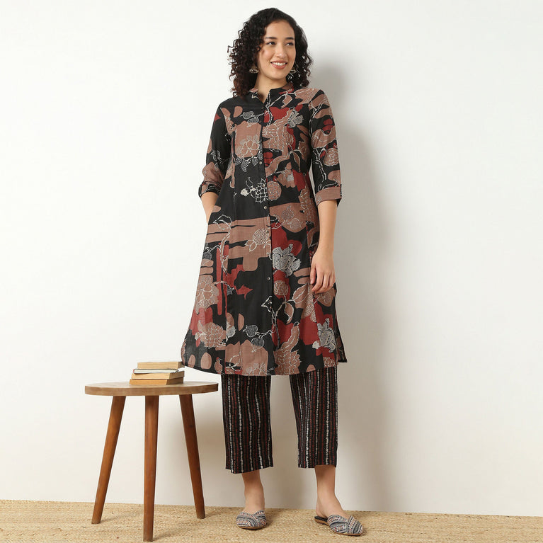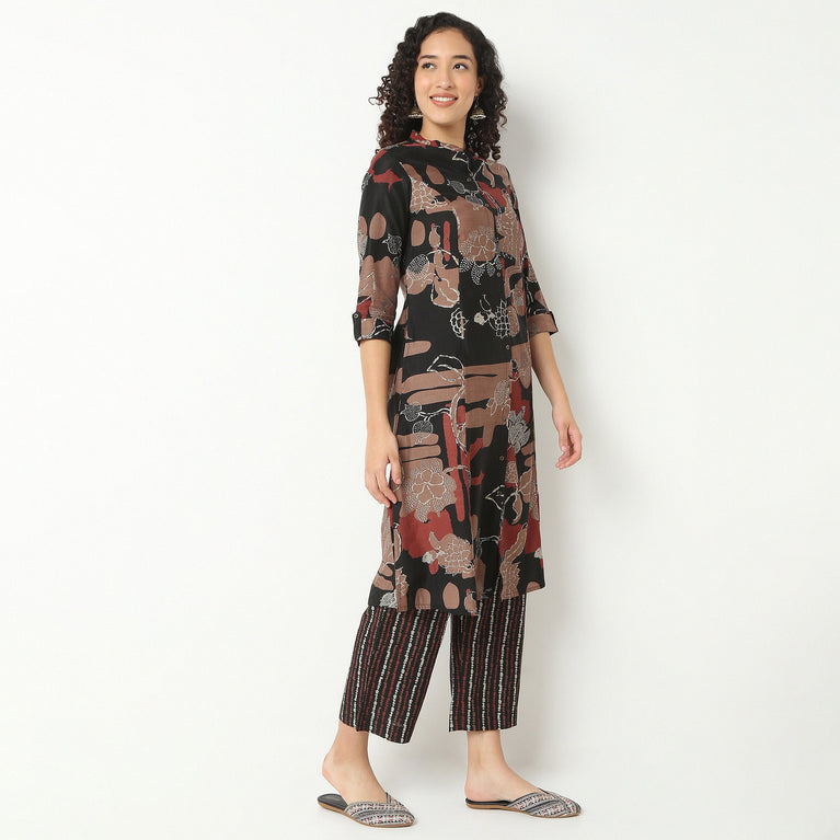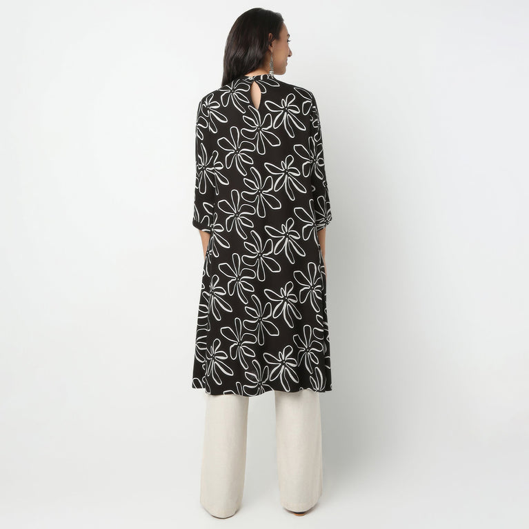 Band Neck Knee Length Three-Fourth Sleeve Straight Fit Printed Kurta