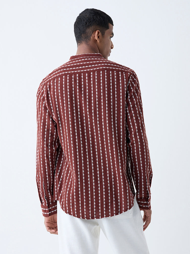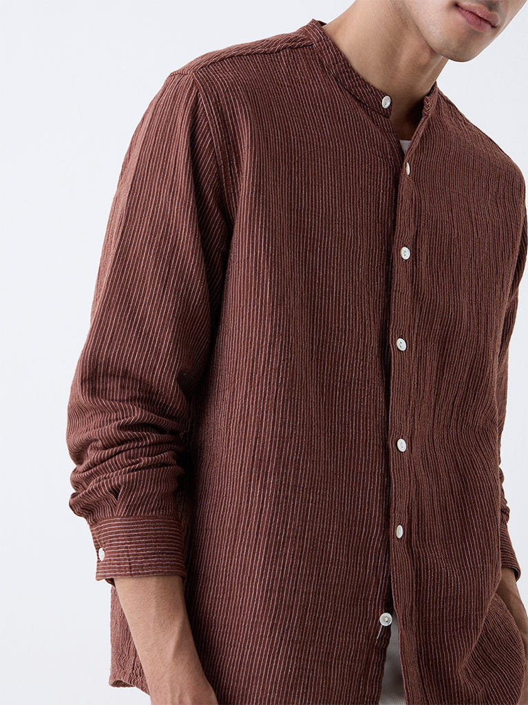 Casual days get a subtle style upgrade with this brown striped shirt from ETA. Crafted from breathable cotton in a relaxed fit, it features soft tonal stripes, a band-neck collar, button placket, and full sleeves.