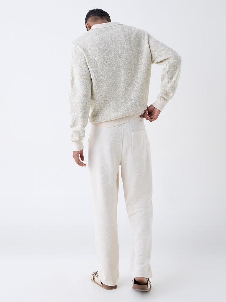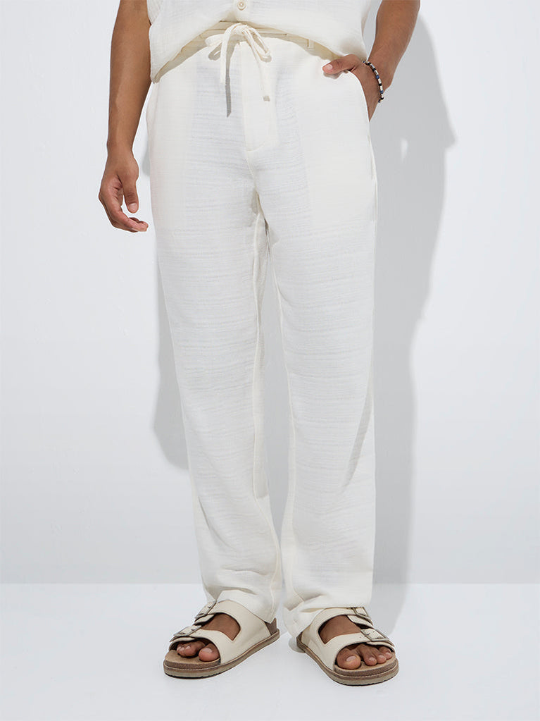 Mid-rise chinos, self-patterned, relaxed fit, pockets, off-white hue, elastic waistband with adjustable drawstrings by ETA.