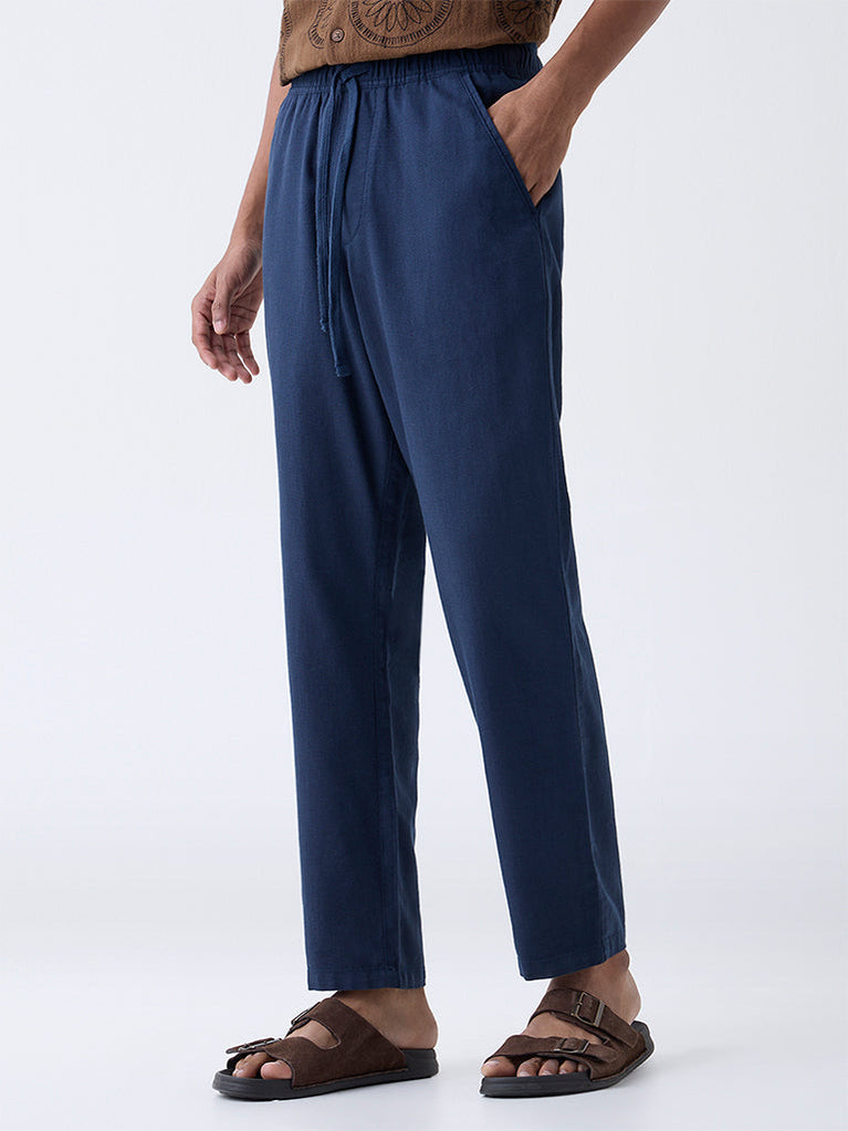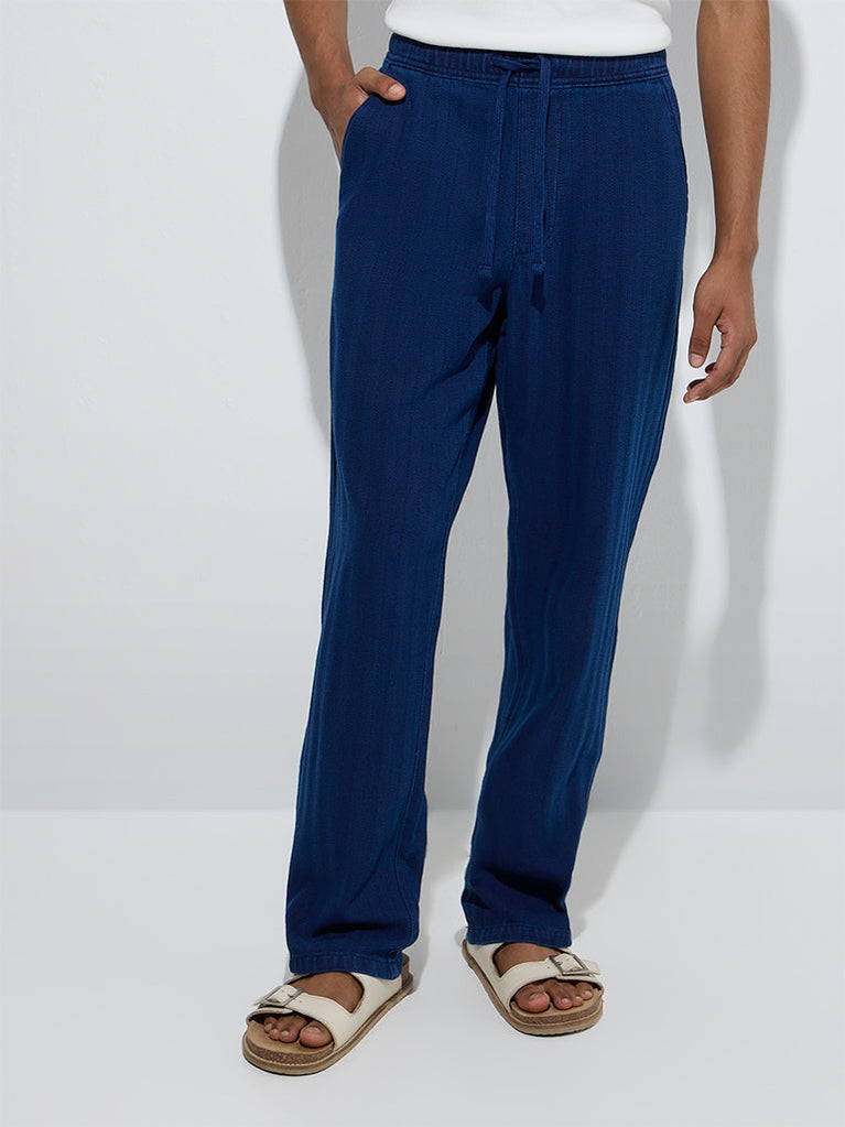 Own the weekend in these indigo chinos from ETA. Woven from a sumptuous fabric with a crinkle-textured finish, they offer all-day comfort without compromising on style. The elastic waistband with adjustable drawstrings ensures a perfect fit, while multiple pockets keep essentials close at hand.