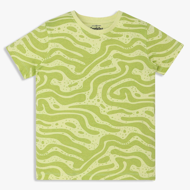 Introducing the Boy's Cotton Crew Neck Graphitee T-Shirt, a perfect blend of comfort and style for active boys. Crafted from soft cotton, this T-shirt features a vibrant all-over print that adds a fun touch to any outfit.