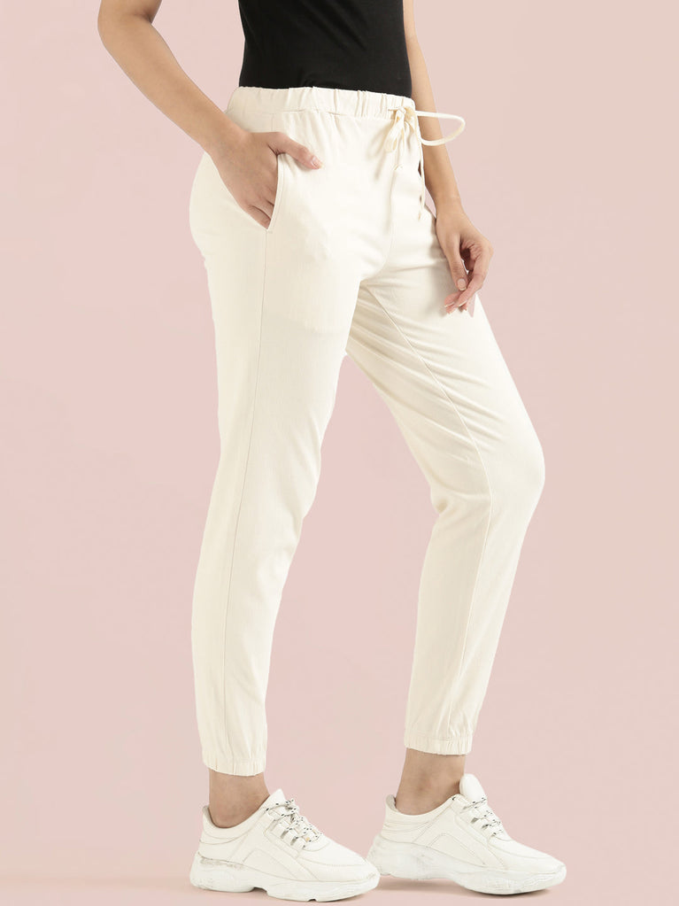 Go from casual to street smart look in a jiffy with the Solid Cream Cotton Pants. Made from cotton, it has a elasticised waistband with drawstring closure, slant pockets, mid rise & a tapered fit.