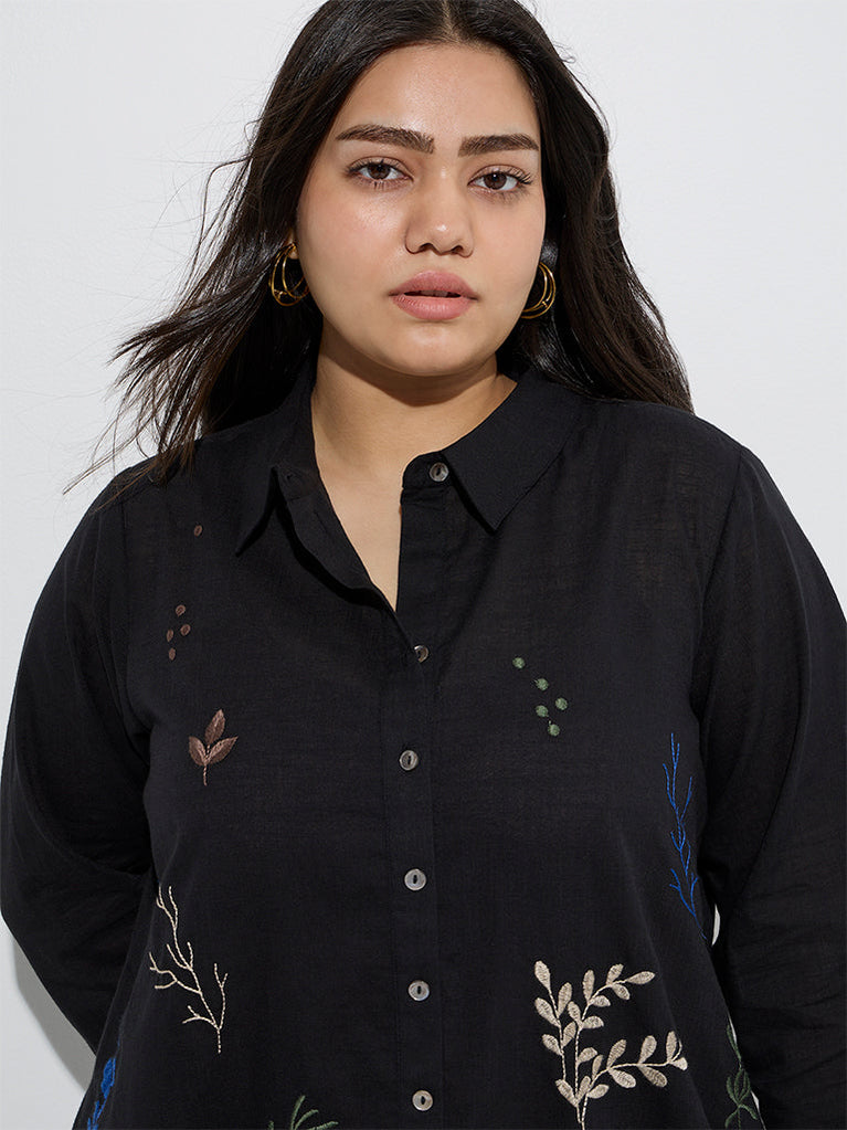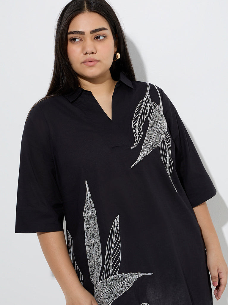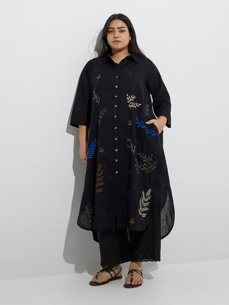 Diza Black Leaf Embroidered A-Line Cotton Kurta