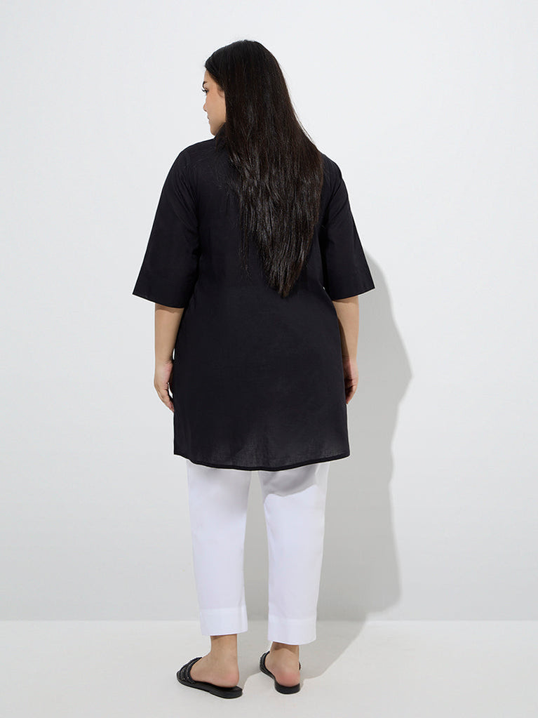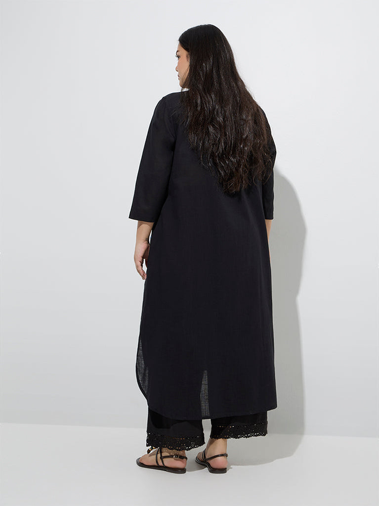 This black kurta from Diza is milled from a cotton-rich fabric and tailored in a breezy A-line silhouette for all-day comfort. Highlighting exquisite leaf embroidery for a touch of charm, it is styled with a collar that extends to a button placket and three-quarter sleeves, making it a graceful pick for ethnic wear.