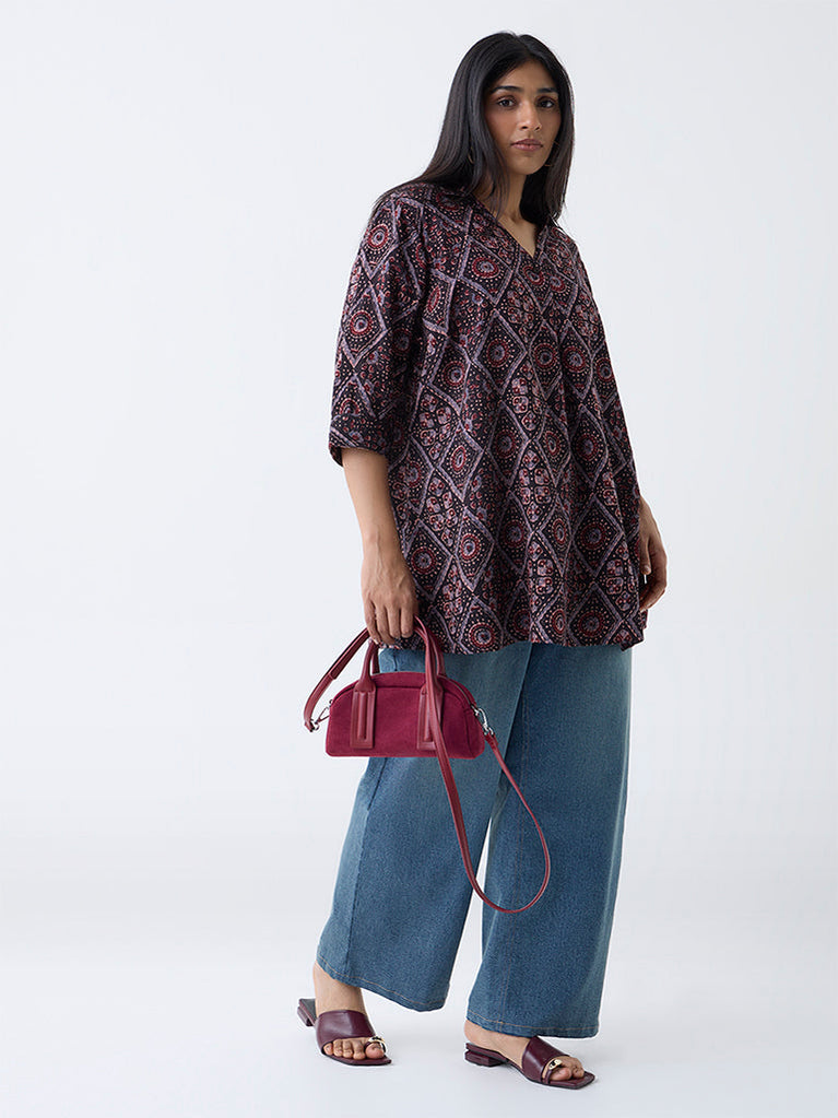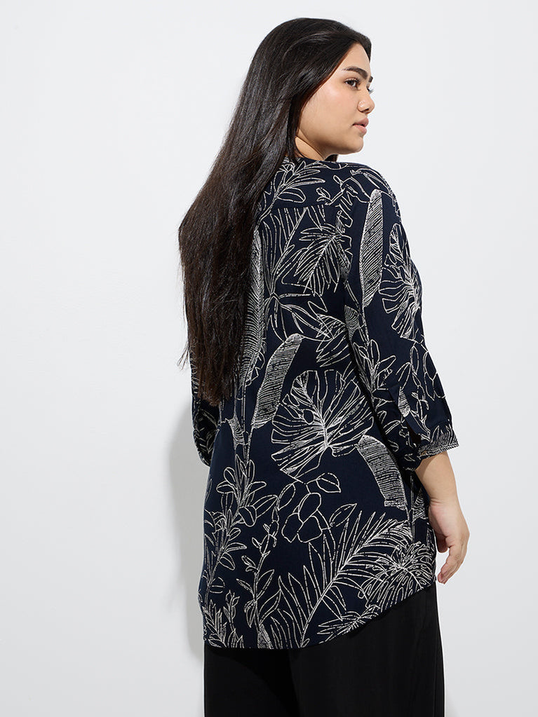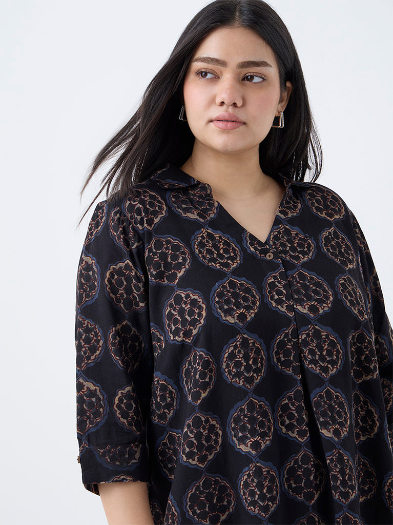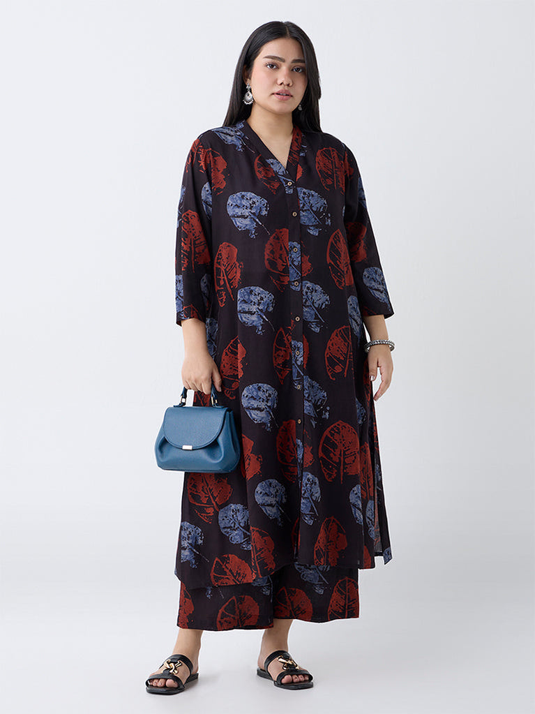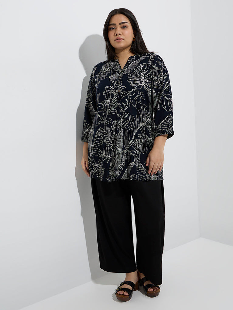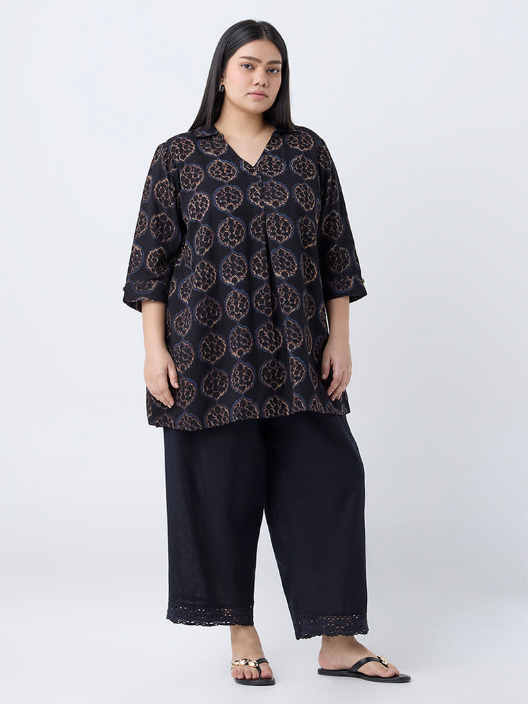 Quietly expressive, this black tunic from Diza is adorned with all-over foliage prints that add timeless charm. Cut from a lightweight fabric that drapes smoothly, it features a spread collar and three-quarter sleeves—an easy, versatile pairing for relaxed ethnic separates.