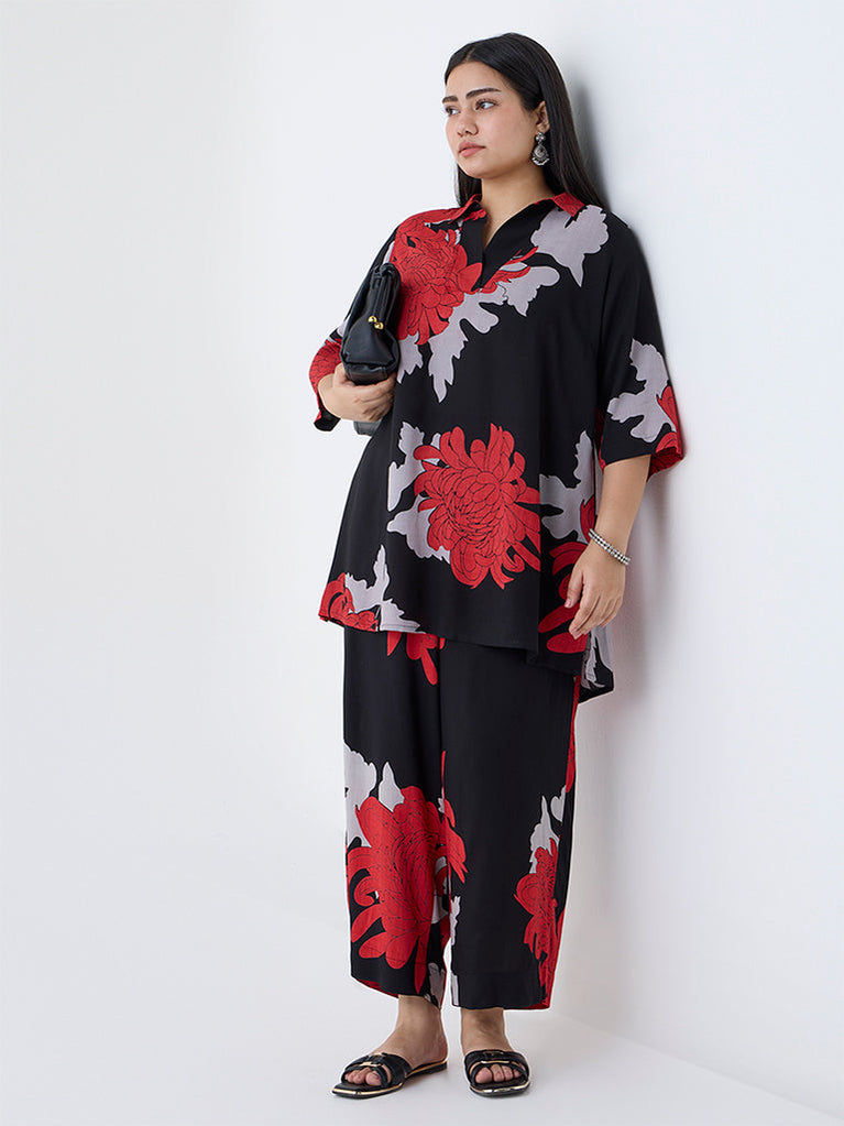 This black kurti from Diza is perfect for both casual and festive occasions. Designed with a flattering high-low silhouette in a smart shirt style, it boasts bold floral patterns for a touch of elegance. Pair with matching palazzos (sold separately) for a polished look.