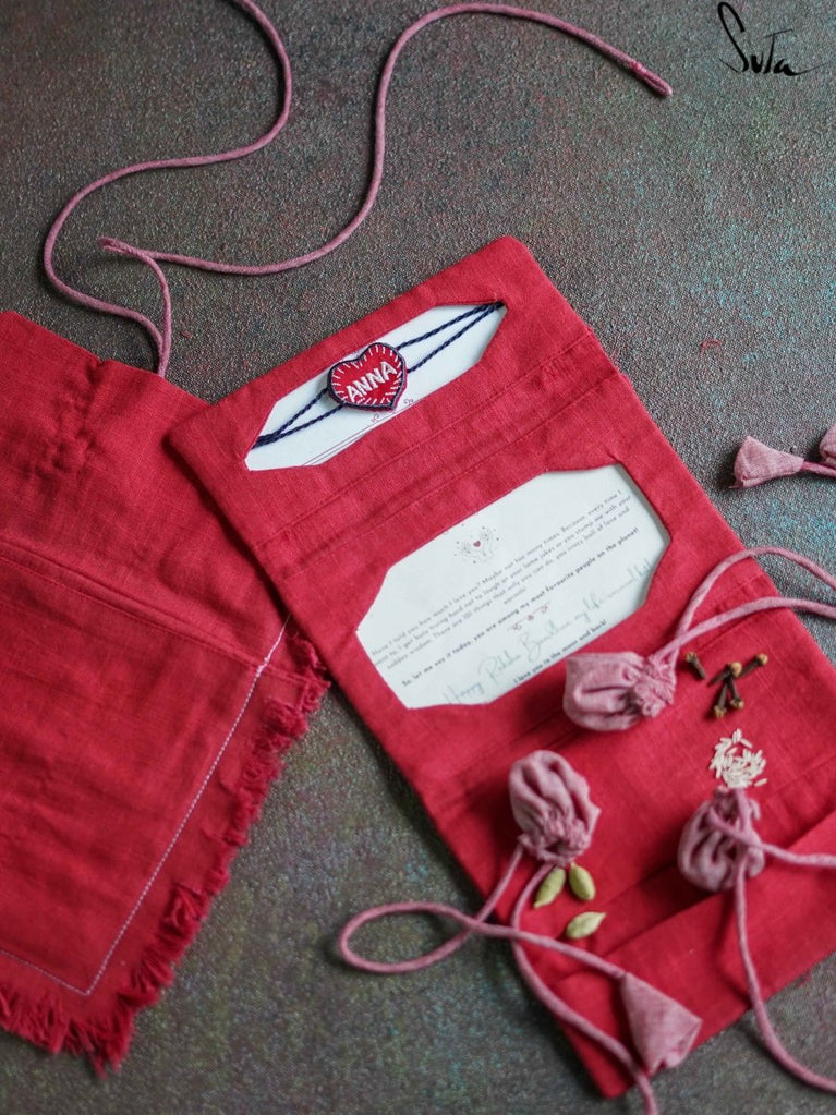 This is a fabric envelope to pack your Rakhi with extra love. The fabric of the envelope is cotton slub and the envelope contains a compartment to place money, a card with a sweet message, 2 small mul pouches with laung-elaichi and rice, respectively and a little coin pouch replica as a stamp.