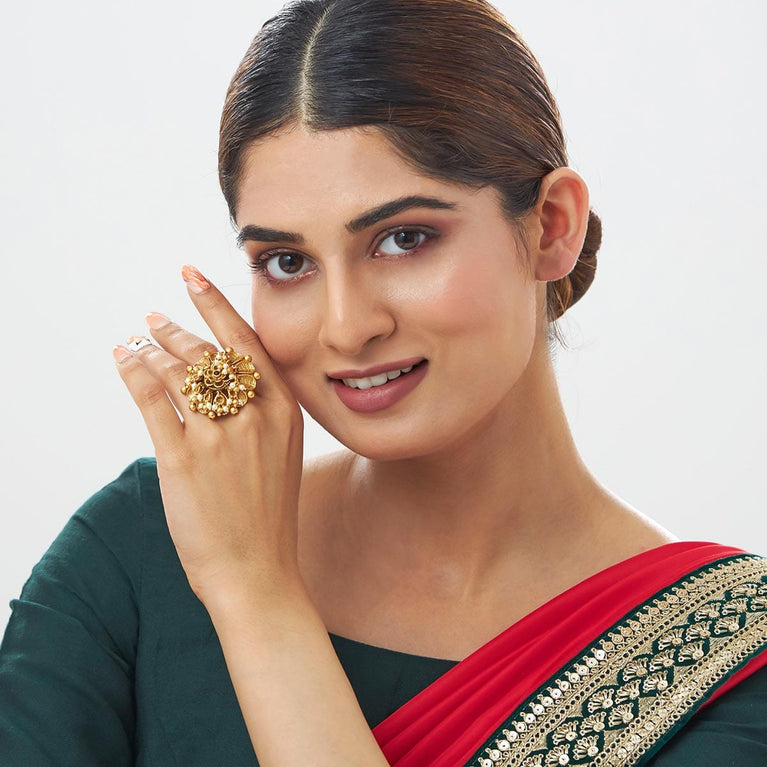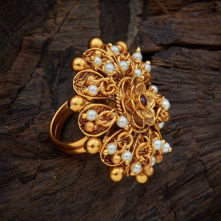 Intricate, festive, and contemporary, this fine ring is all. Adding a refreshing feel of full bloom, the white pearls, embossed gold plated floral design, floral rim, and hint of ruby stone, makes your look more exquisite and unique.