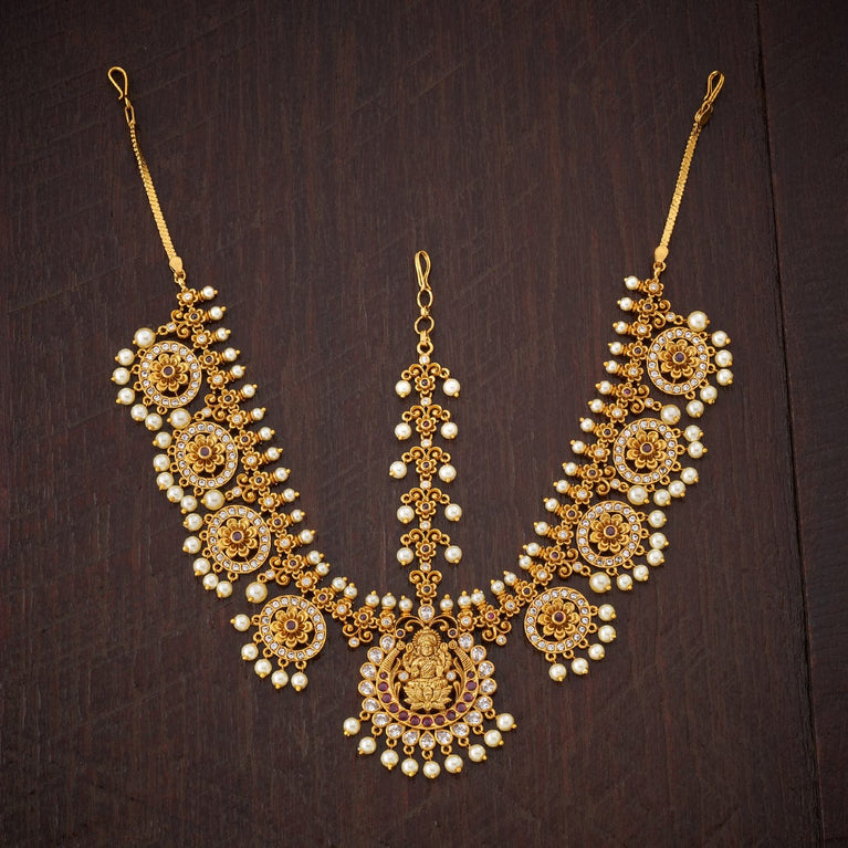Kushal's Fashion Jewellery Flower Motif Antique TikkaLooking for some beautiful hair accessories for a traditional event? This antique Tikka is a perfect piece to add to your traditional look. The floral carving and tiny leaf design embellished with Ruby stones and hanging pearls are alluring enough for a stunning presence. Style it with loose hair or any other hairstyle and impress everyone on this festive occasion.
