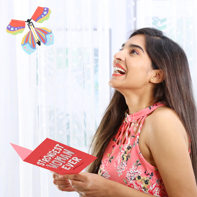 Specifications: Size of the card – 12 x 17 cm The card has to be opened with a mild jerk for best results. Sometimes, the butterfly tends to get tired during the shipment journey. If possible, we request you to open the card when you receive it and twist the butterfly’s tail the same way you rotate a key to recharge it. Once you’ve completed the motion 30-40 times, place it inside the card and close it.