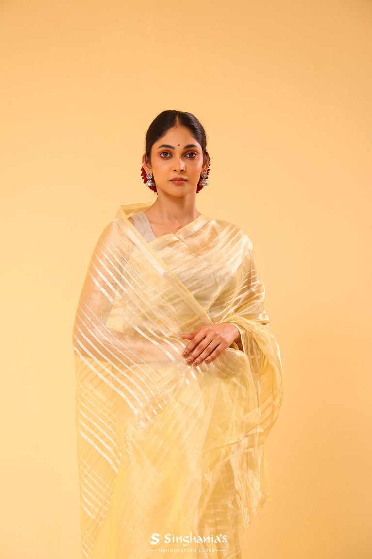 This is a flax gold tissue banarasi silk saree for festive, wedding occasions and party wear. Adorned with gold zari stripes weaving all over the body and very small border, completing the whole look.