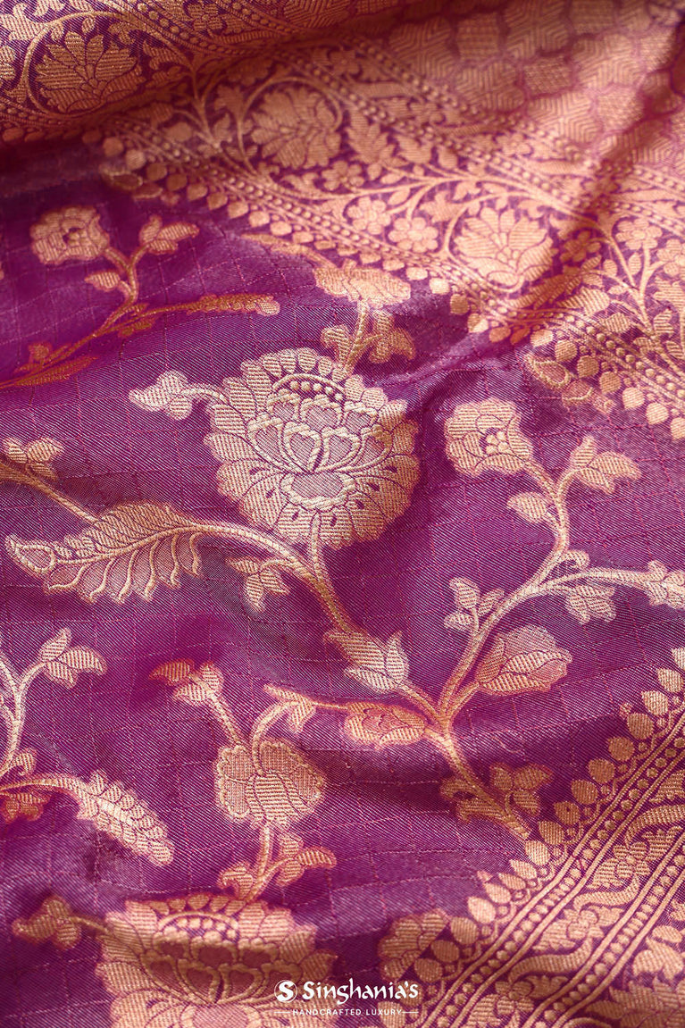This is a traditional purple tissue banarasi saree for festive, wedding occasions and party wear. Adorned with gold zari floral butta jaal weaving all over the body and a small, floral creeper border and pallu, completing the whole look.