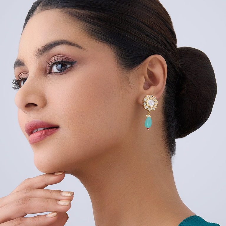 Kushal's Fashion Jewellery Flower Motif Kundan EarringKundan earrings are one of the best accessories to wear with a traditional outfit, and with matching accessories, you can also wear them with fancy outfits. Keeping this in mind, we present our latest pair of Kundan earrings for your accessory collection. All you have to do is wear them with your favorite outfit to be the trendsetter.
