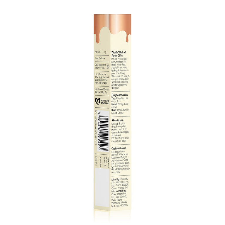 Nuttin' But A Sweet ClickIndia's 1st solid gel perfume stick! It's sleek, mess-free, long-lasting & fits even in your tiniest bag. 250+ uses, no sprays, no spills.Every glide smells like pistachio gelato whispering ""bonjour""