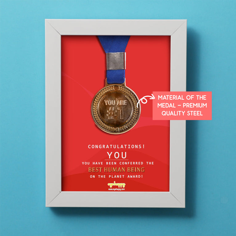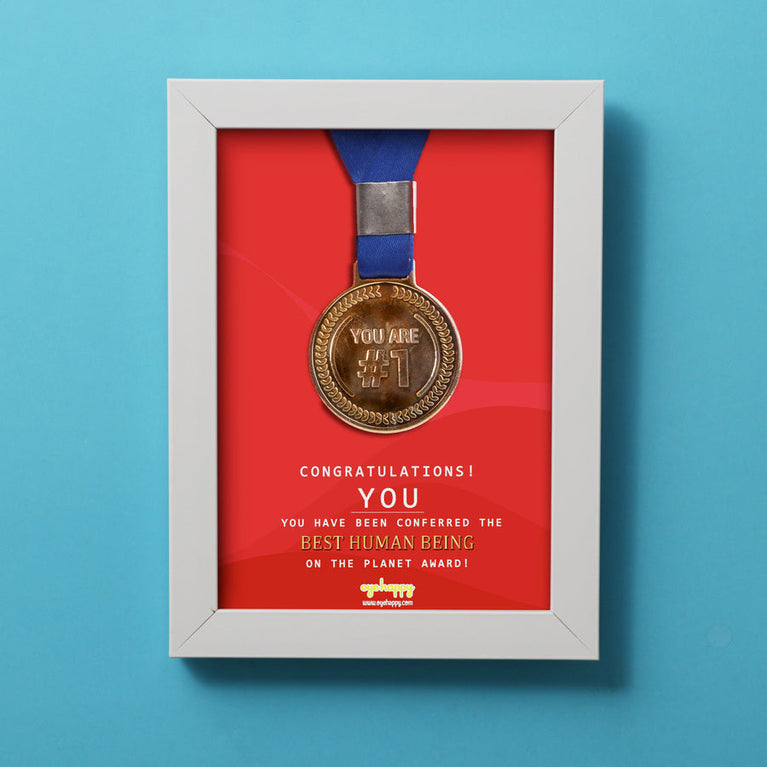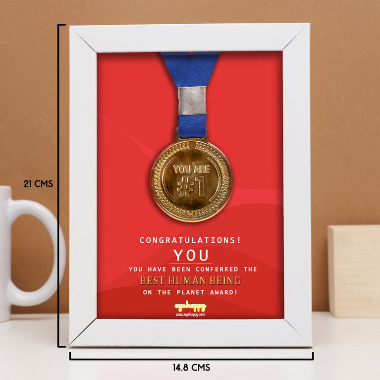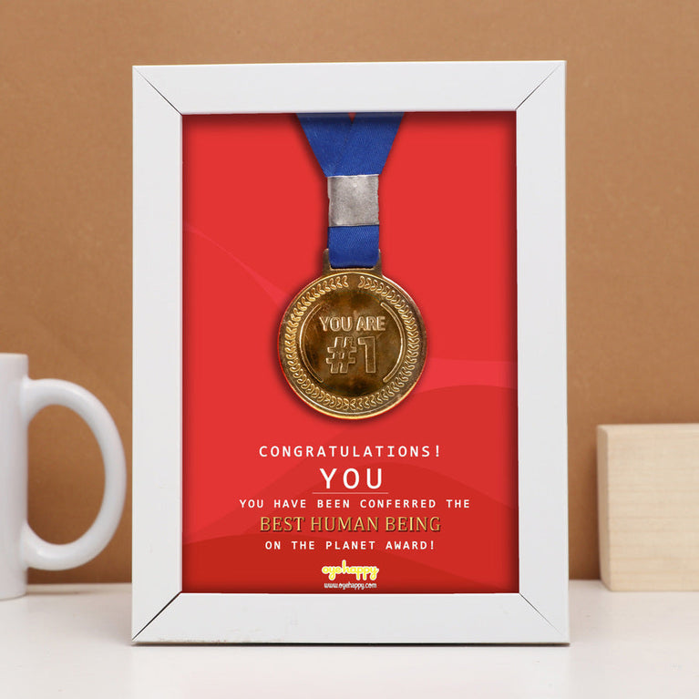 We all know someone who is the sweetest and kindest of all. They deserve all the appreciation in this world for the sweet bundle of happiness they are. Give that cute person the ultimate compliment with our Best Human Being Certificate. This sweet and adorable frame comes with a medal (yes, a real medal) that certifies your favorite human as the Best Human Being on the planet earth. Go ahead, make their day!Specifications:Size of the Frame - 12.5 x 17.5 cmMaterial of the Frame - WoodSize of the Medal - 5.5 cm