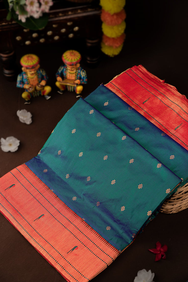 Mandir Peacock Blue & Red Paithani Buttis Saree