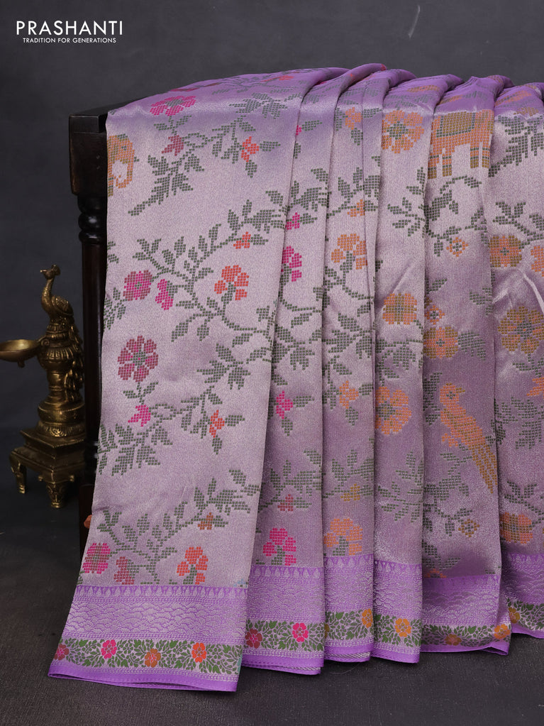 Banarasi semi raw silk saree lavender with allover silver zari woven floral weaves and floral design paithani border