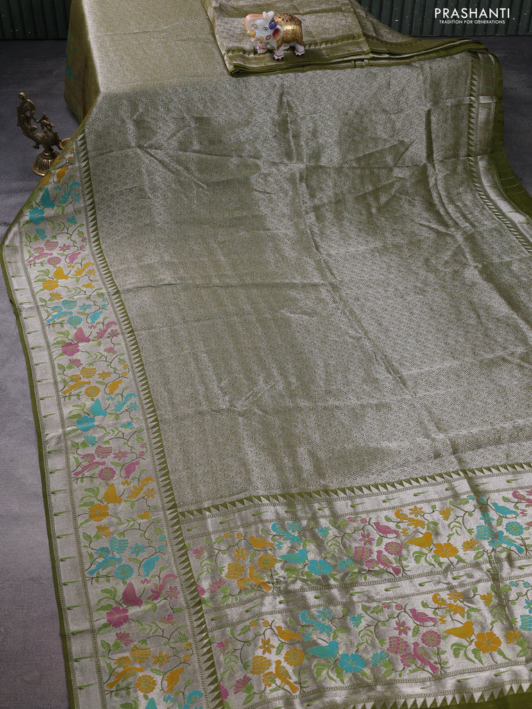 Banarasi semi raw silk saree mehendi green with allover silver zari woven floral weaves and floral design paithani border