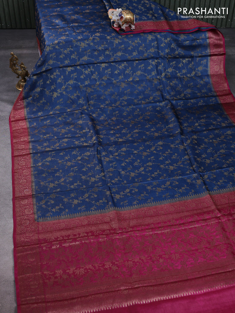Banarasi tussar silk saree peacock blue and magenta pink with thread & zari woven buttas and woven border
