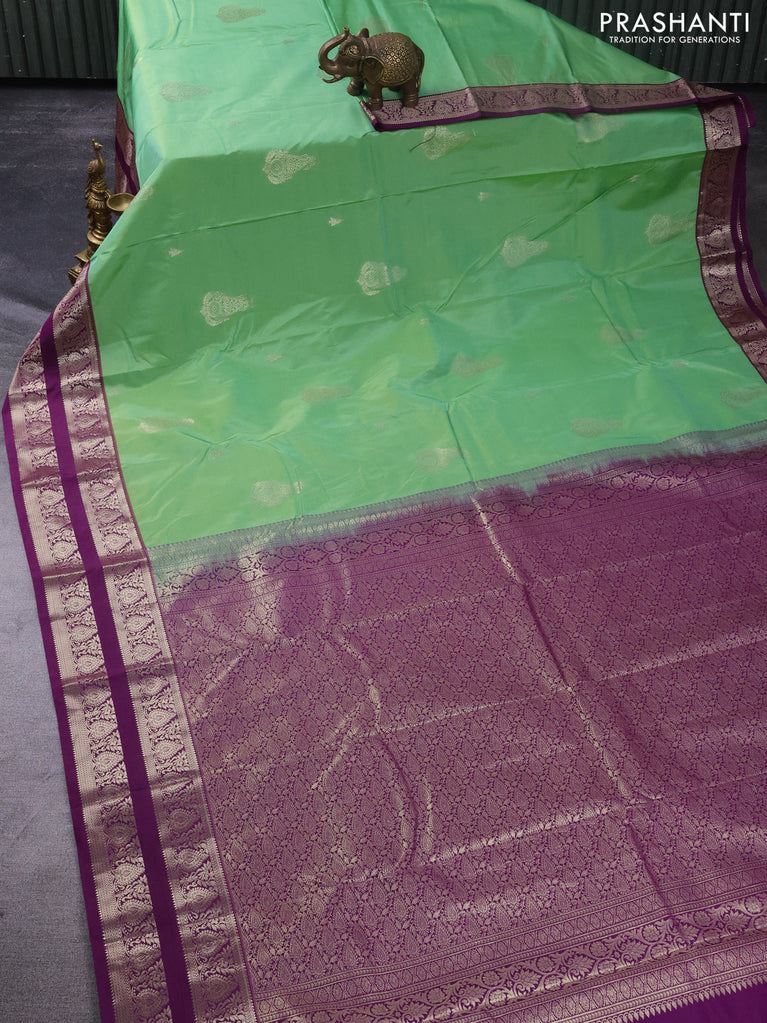 Bangalori silk saree pastel green and deep purple with zari woven buttas and zari woven border