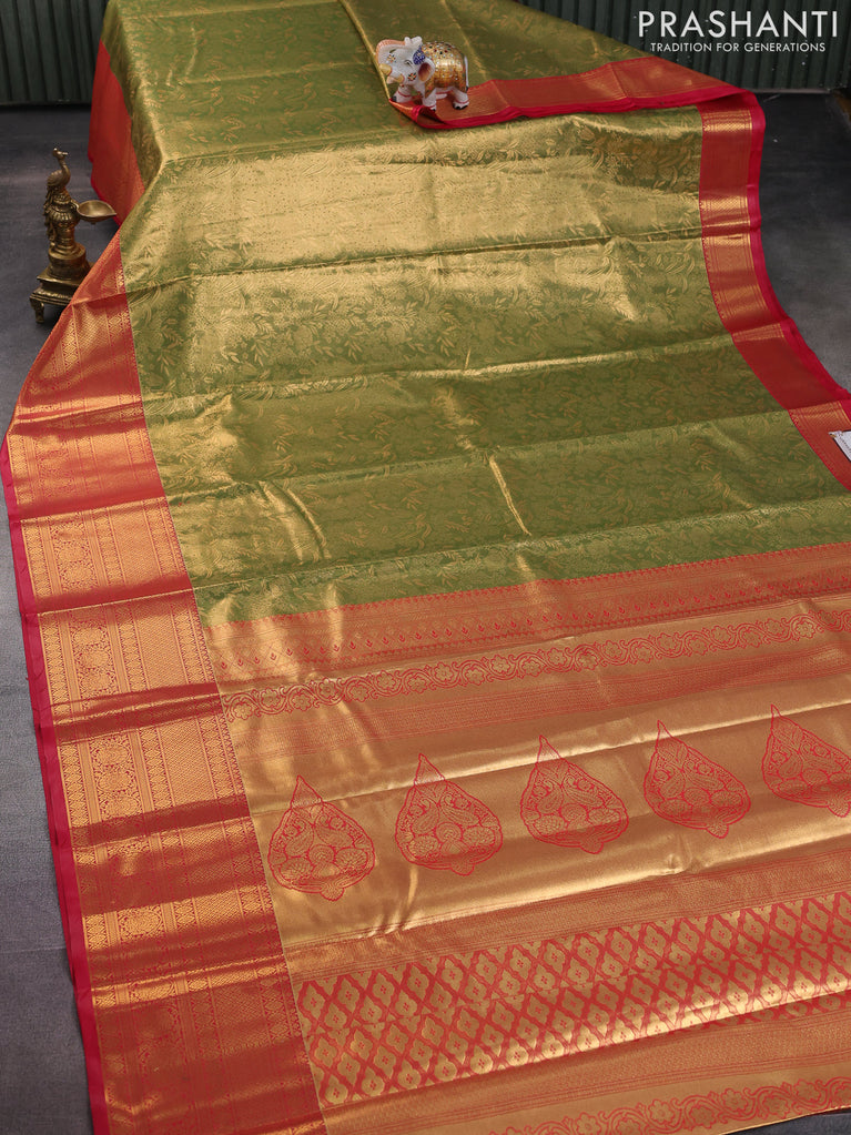 Bangalori tissue silk saree green shade and pink with allover zari woven brocade weaves and long zari woven border