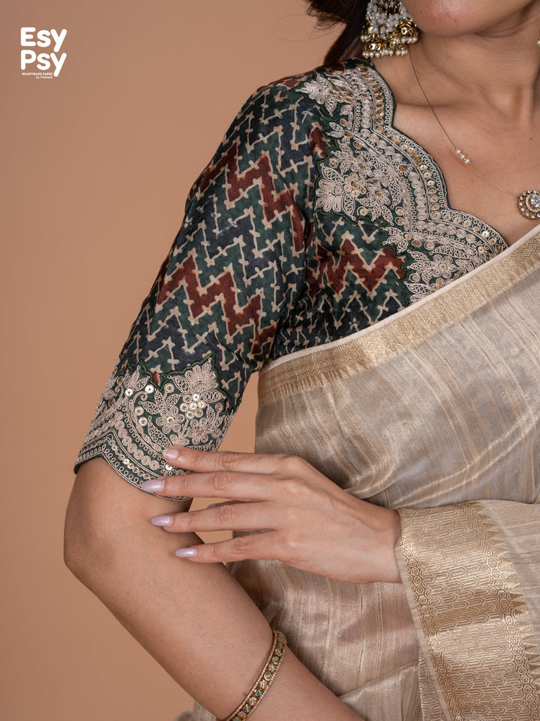 Beige Raw Silk readymade saree with readymade ajrakh printed blouse
