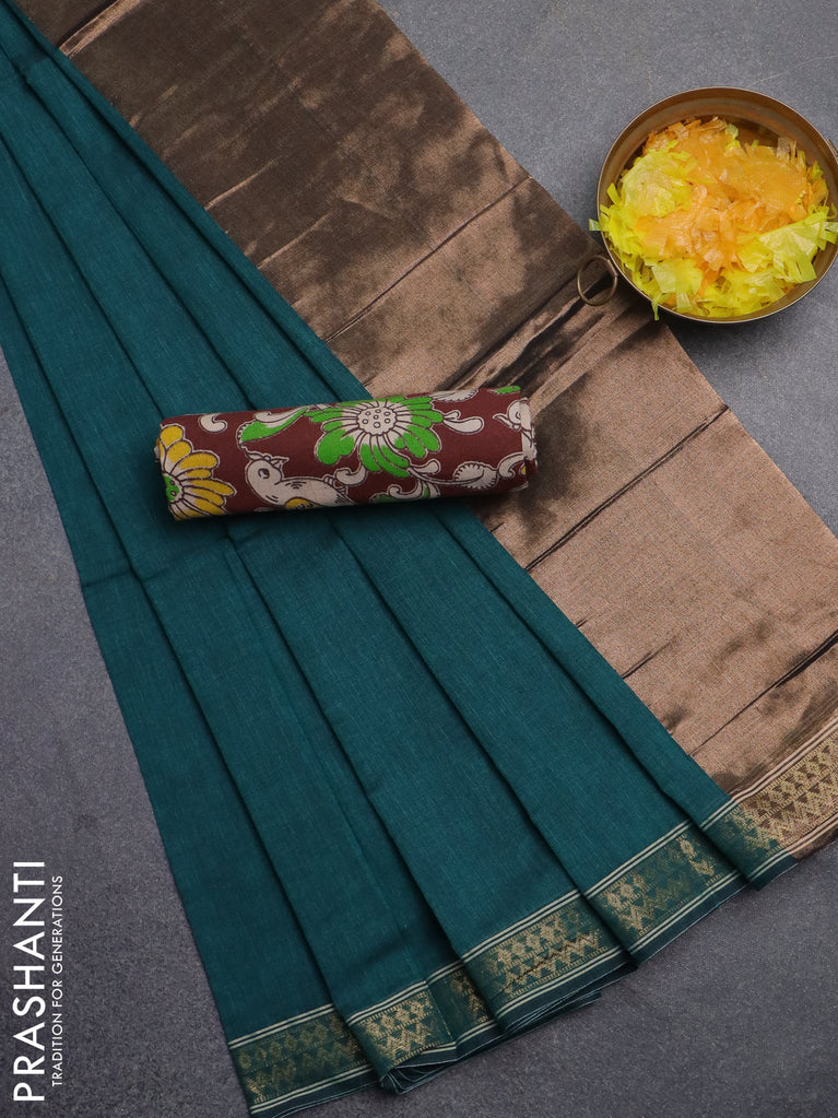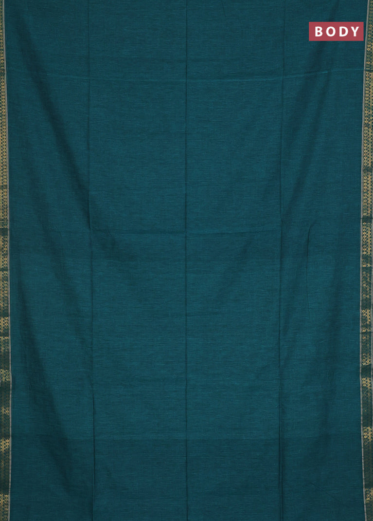 Bengal soft cotton saree teal green shade with plain body and zari woven piping border