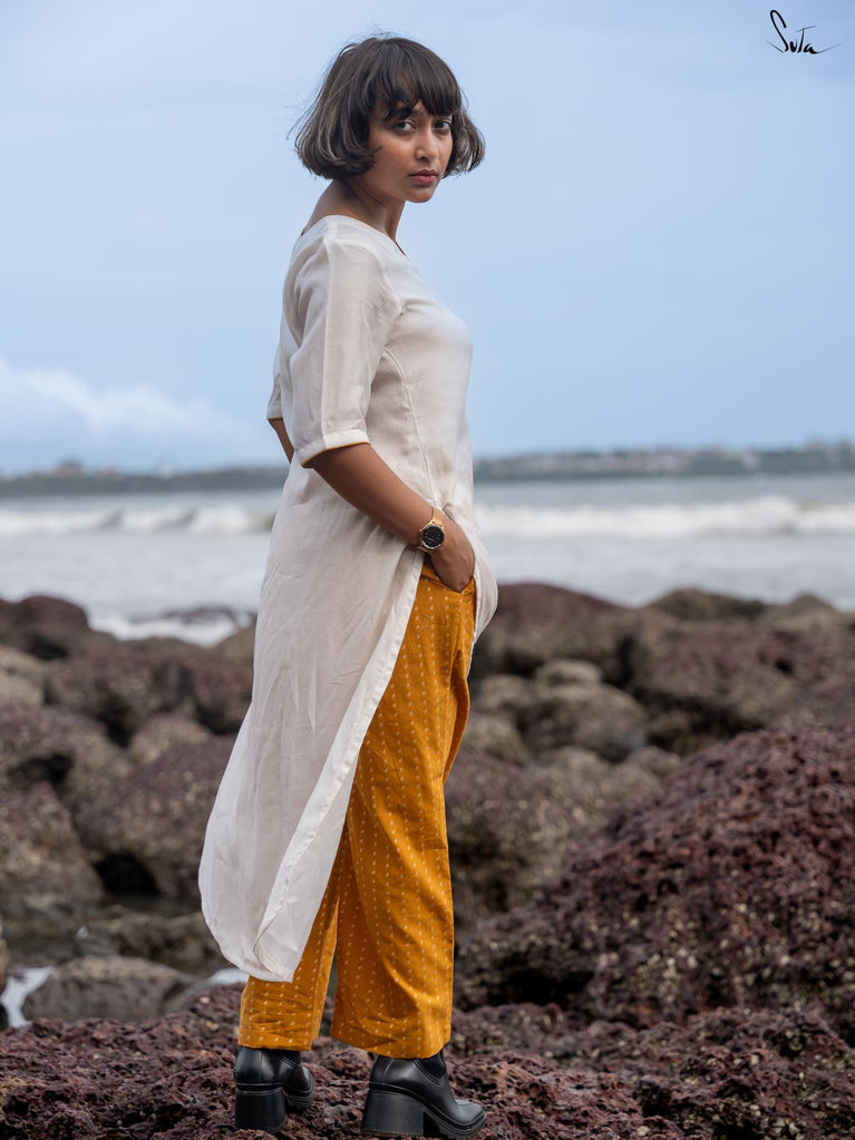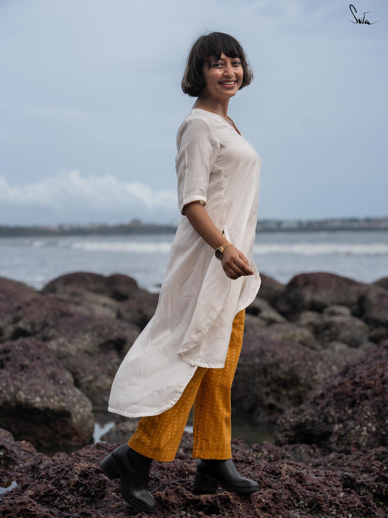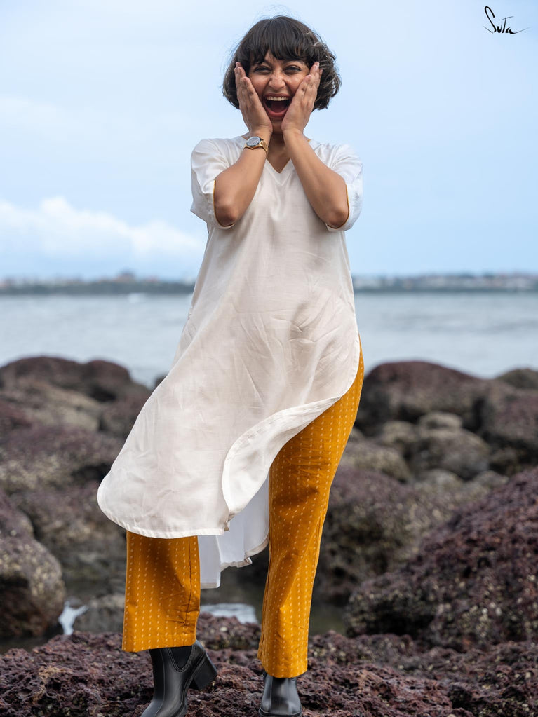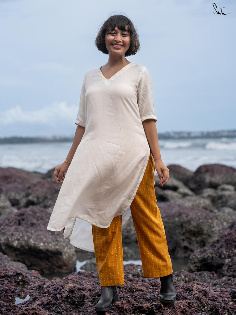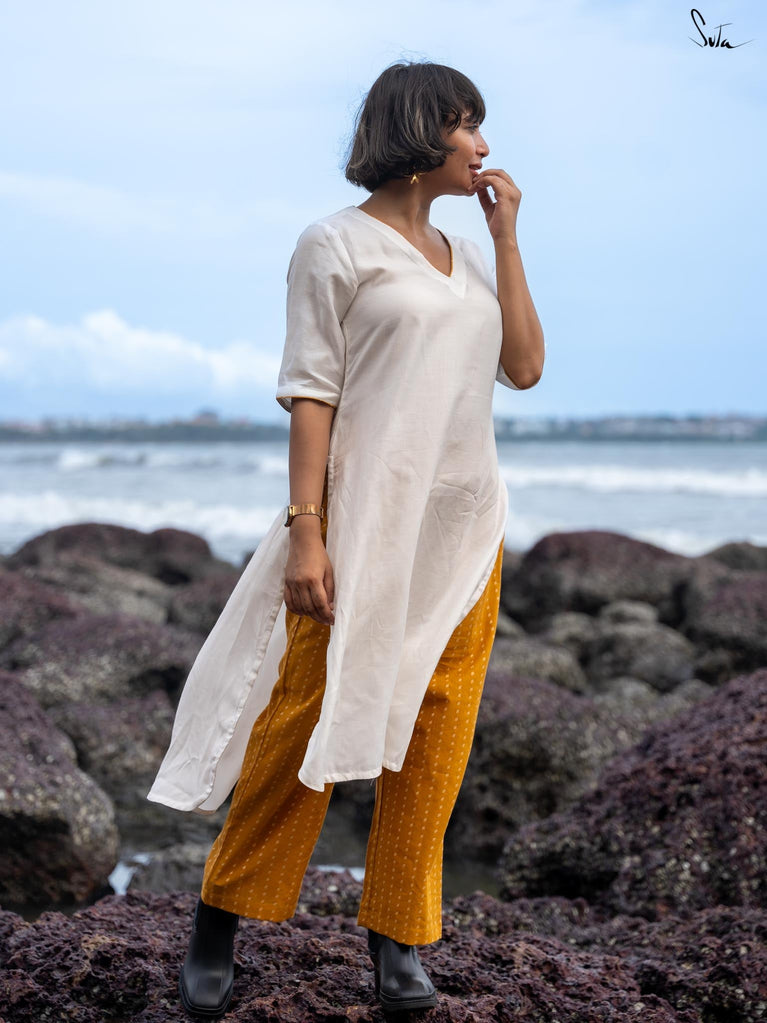 Colour: White And MustardWash Care : Dry WashNeckline : V Neck Sleeves : Full SleeveSleeve length : 0.27 m ( 27 cm)Front neck depth : 0.21 m (21 cm)