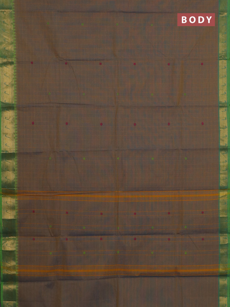 Chettinad cotton saree dual shade of bluish mustard and green with allover checks & buttas and zari woven muniya style border