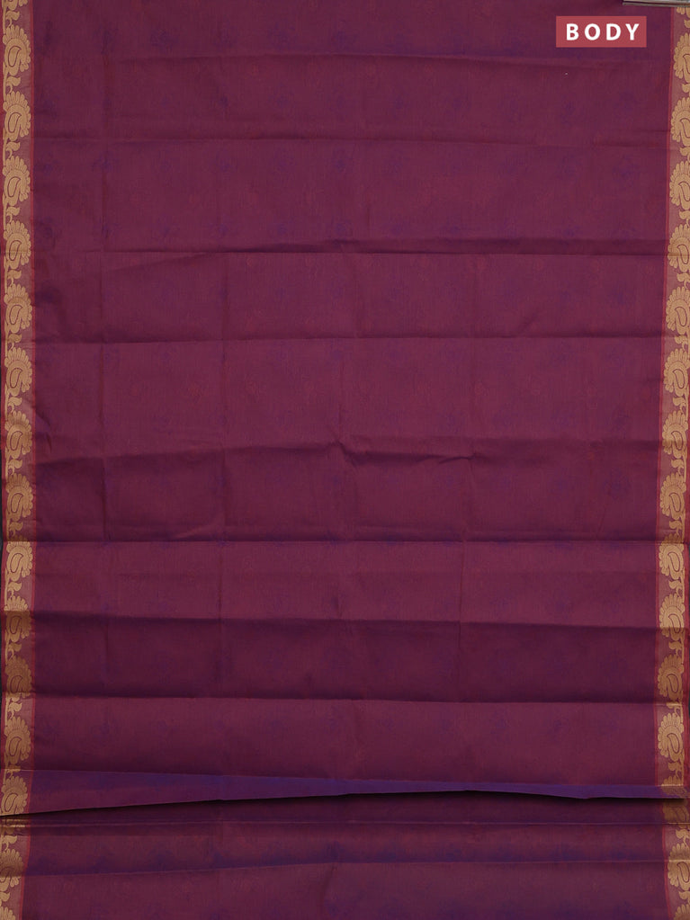 Coimbatore cotton saree dual shade of yellowish purple with allover self emboss and thread woven border