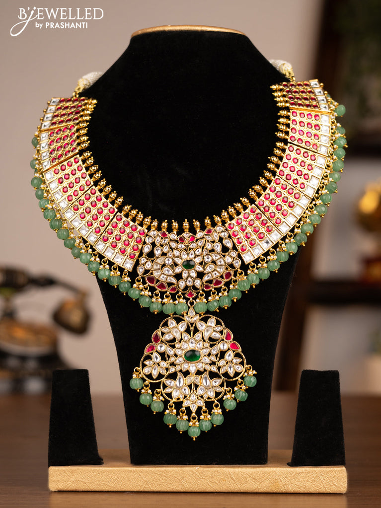 Antique necklace with jadau kundan stones and pearl & golden beads hanging without earrings